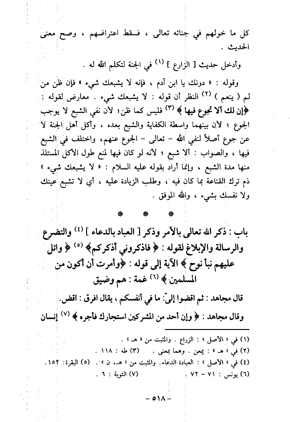 كل ما خولهم فى جناته تعالى، فسقط اعتراضهم، وصح معنى الحديث. وأدخل حديث الزارع فى الجنة لتكلم الله له. وقوله: (دونك يا ابن آدم، فإنه لا يشبعك شىء) فإن ظن من لم ينعم النظر أن قوله: لا يشبعك شىء. معارض لقوله: (إِنَّ لَكَ أَلاَّ تَجُوعَ فِيهَا) [طه: 118] ، فليس كما ظن؛ لأن نفى الشبع لا يوجب الجوع؛ لأن بينهما واسطة الكفاية والشبع بعده، وأكل أهل الجنة لا عن جوع أصلاً لنفى الله تعالى الجوع منهم، واختلف فى الشبع فيها، والصواب: ألا شبع؛ لأنه لو كان فيها طول الأكل المستلذ منها مدة الشبع، وإنما أراد بقوله (صلى الله عليه وسلم) : (لا يشبعك شىء) ذم ترك القناعة بما كان فيه، وطلب الزيادة عليه، أى لا تشبع عينك ولا نفسك بشىء، والله الموفق.