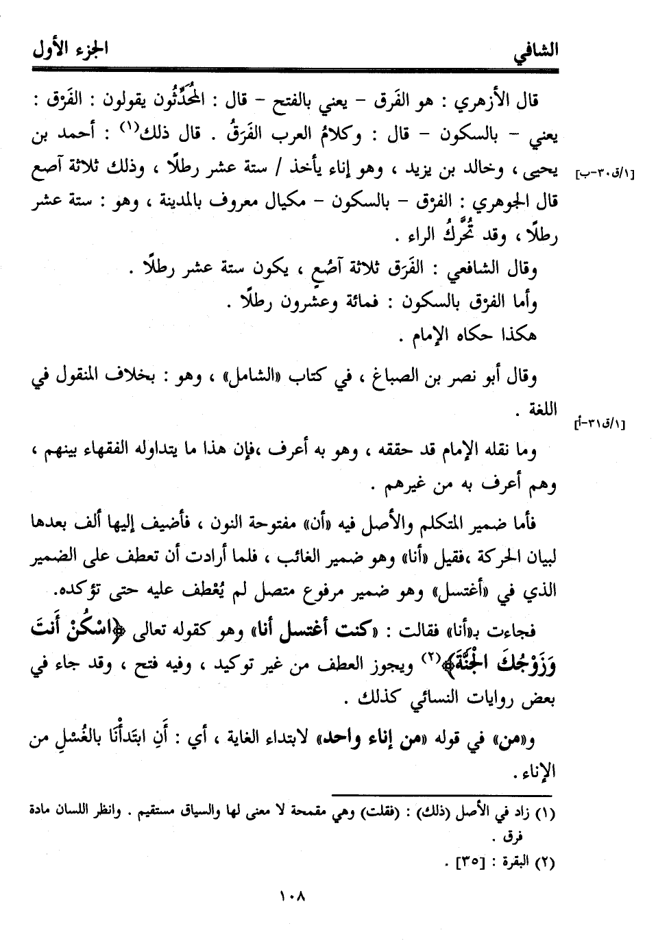 قال الأزهري: هو الفَرق -يعني بالفتح- قال: المُحَدِّثُون يقولون: الفَرْق: يعني -بالسكون - قال: وكلامُ العرب الفَرَقُ. قال ذلك (¬1): أحمد بن يحيى، وخالد بن يزيد، وهو إناء يأخذ ستة عشر رطلًا، وذلك ثلاثة آصع قال الجوهري: الفرْق -بالسكون- مكيال معروف بالمدينة، وهو: ستة عشر رطلًا، وقد تُحَّركُ الراء.