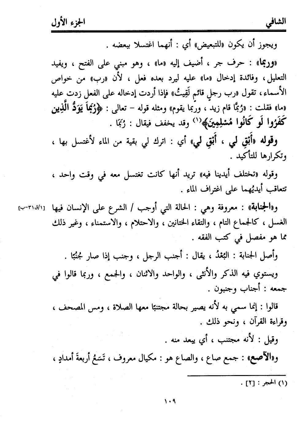 "وربما": حرف جر، أضيف إليه "ما"، وهو مبني على الفتح، ويفيد التعليل، وفائدة إدخال "ما" عليه ليرد بعده فعل، لأن "رب" من خواص الأسماء، تقول "رب رجلٍ قائمٍ لَقِيتُ" فإذا أردت إدخاله على الفعل زدت عليه "ما" فقلت: "رُبَّما قام زيد، وربما يقوم" ومثله قوله -تعالى: {رُبَمَا يَوَدُّ الَّذِينَ كَفَرُوا لَوْ كَانُوا مُسْلِمِينَ} (¬1) وقد يخفف فيقال: رُبَمَا.