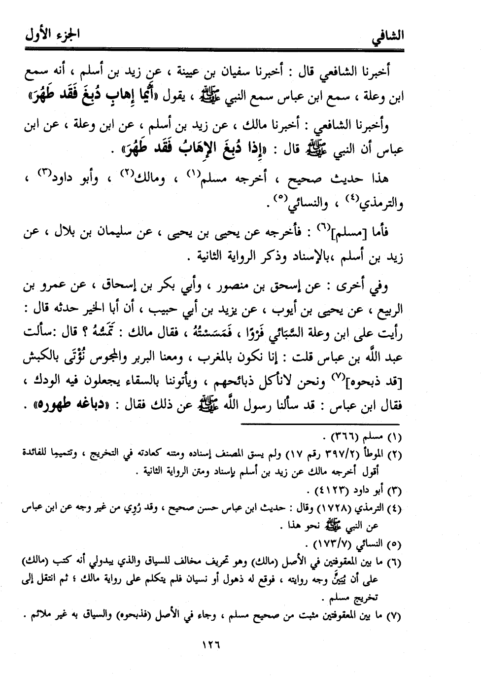 أخبرنا الشافعي قال: أخبرنا سفيان بن عيينة، عن زيد بن أسلم، أنه سمع ابن وعلة، سمع ابن عباس سمع النبي - صلى الله عليه وسلم -، يقول "أَيُّما إِهابٍ دُبغَ فَقَد طَهُرَ" وأخبرنا الشافعي: أخبرنا مالك، عن زيد بن أسلم، عن ابن وعلة، عن ابن عباس أن النبي - صلى الله عليه وسلم - قال: "إِذا دُبِغَ الإِهَابُ فَقَد طَهُرَ".
