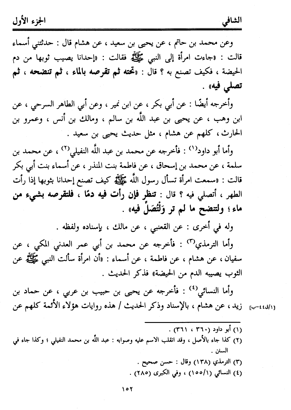 وعن محمد بن حاتم، عن يحيى بن سعيد، عن هشام قال: حدثتني أسماء قالت: "جاءت امرأة إلى النبي - صلى الله عليه وسلم - فقالت: "إحدانا يصيب ثوبها من دم الحيضة، فكيف تصنع به؟ قال: "تحته ثم تقرصه بالماء، ثم تنضحه، ثم تصلي فيه".