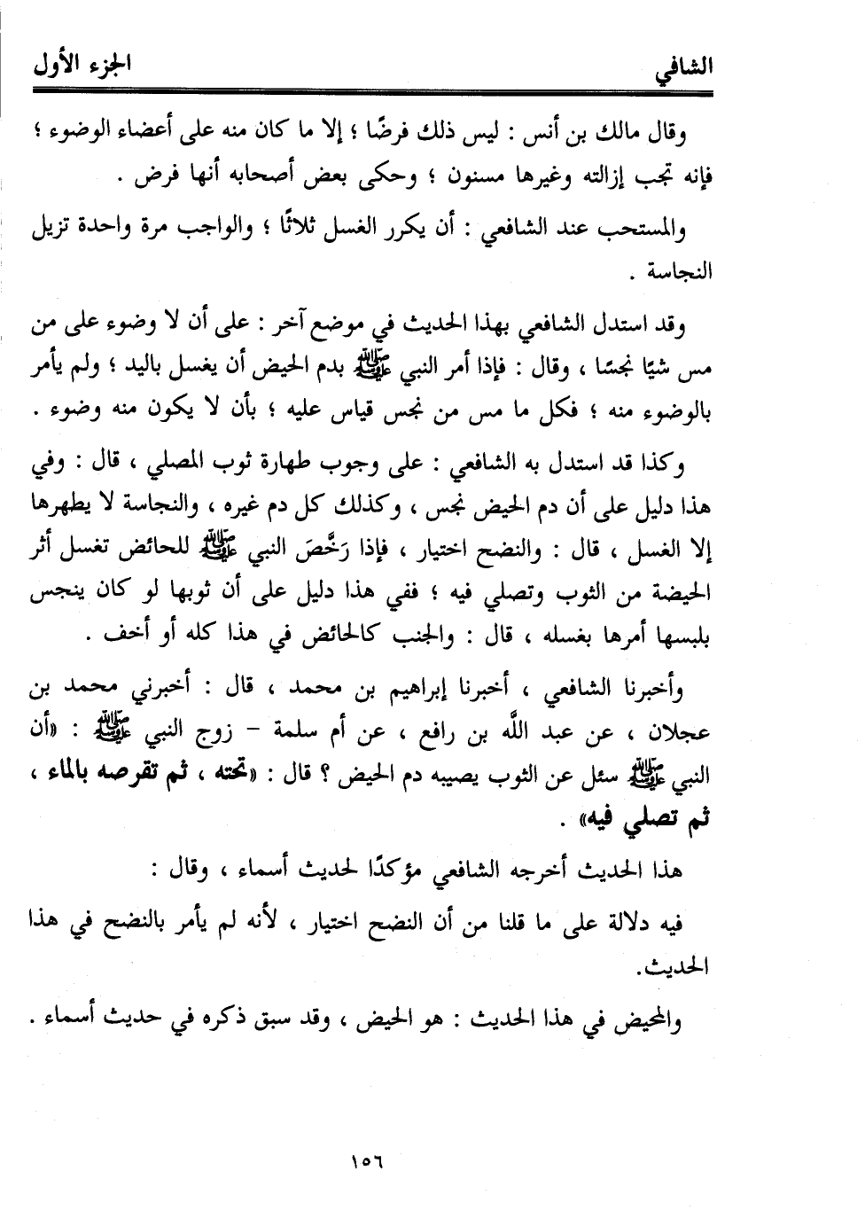 وأخبرنا الشافعي، أخبرنا إبراهيم بن محمد، قال: أخبرني محمد بن عجلان، عن عبد اللَّه بن رافع، عن أم سلمة -زوج النبي - صلى الله عليه وسلم -: "أن النبي - صلى الله عليه وسلم - سئل عن الثوب يصيبه دم الحيض؟ قال: "تحته، ثم تقرصه بالماء، ثم تصلي فيه".
