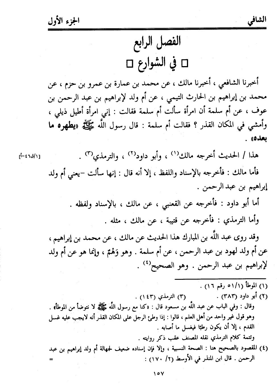 أخبرنا الشافعي، أخبرنا مالك، عن محمد بن عمارة بن عمرو بن حزم، عن محمد بن إبراهيم بن الحارث التيمي، عن أم ولد لإبراهيم بن عبد الرحمن بن عوف، عن أم سلمة أن امرأة سألت أم سلمة فقالت: إني امرأة أطيل ذيلي، وأمشي في المكان القذر؟ فقالت أم سلمة: قال رسول اللَّه - صلى الله عليه وسلم - "يطهره ما بعده".