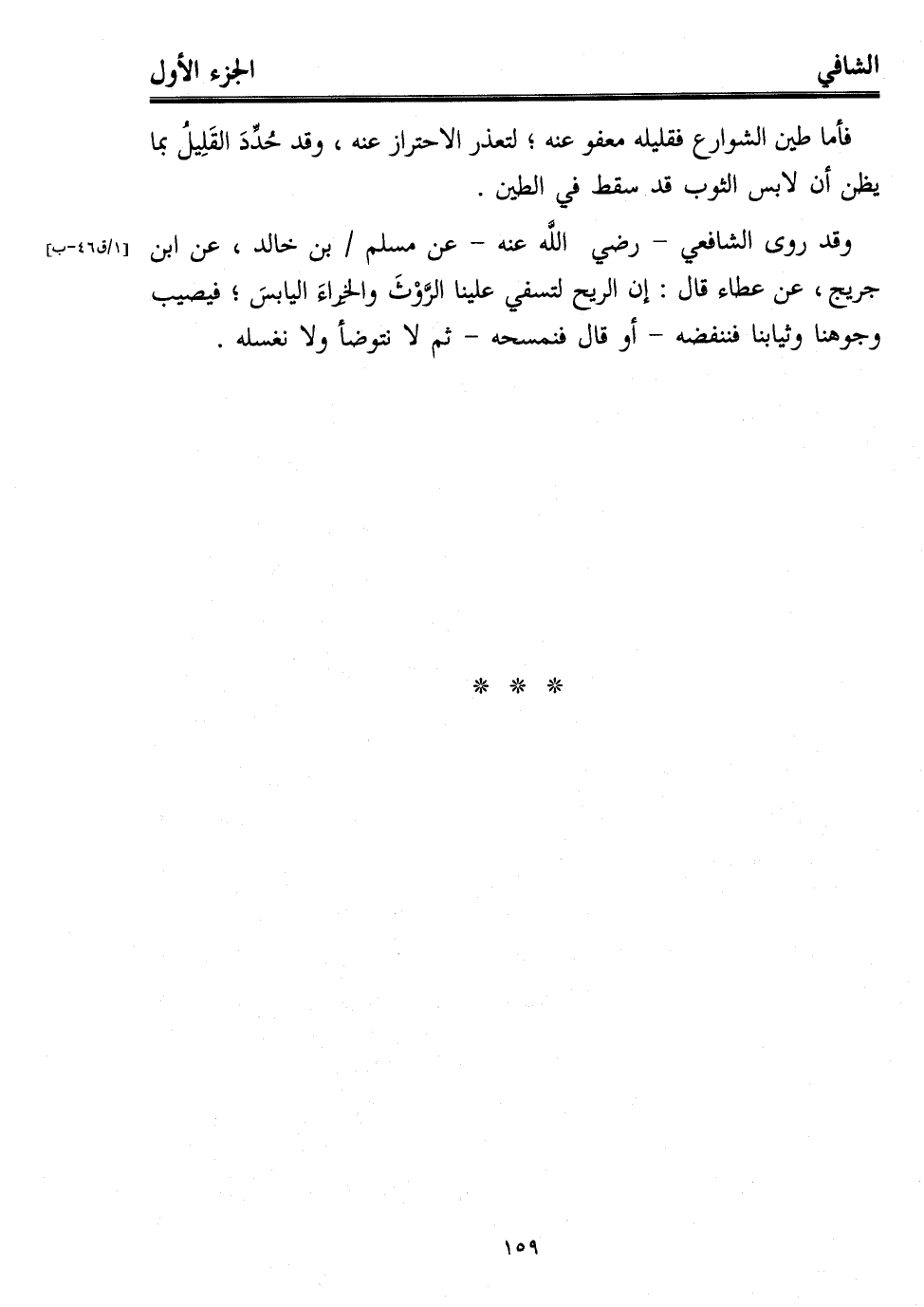 وقد روى الشافعي -رضي اللَّه عنه- عن مسلم بن خالد، عن ابن جريج، عن عطاء قال: إن الريح لتسفي علينا الرَّوْثَ والخِراءَ اليابسَ؛ فيصيب وجوهنا وثيابنا فننفضه -أو قال فنمسحه- ثم لا نتوضأ ولا نغسله.