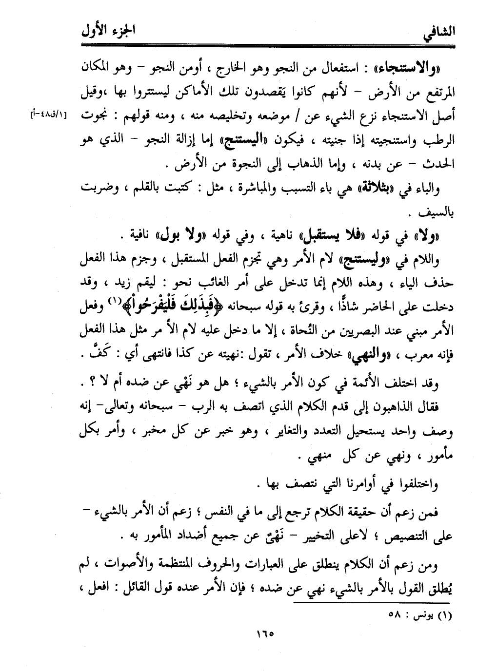 واللام في "وليستنج" لام الأمر وهي تجزم الفعل المستقبل، وجزم هذا الفعل حذف الياء، وهذه اللام إنما تدخل على أمر الغائب نحو: ليقم زيد، وقد دخلت على الحاضر شاذًّا، وقرئ به قوله سبحانه {فَبِذَلِكَ فَلْيَفْرَحُوا} (¬1) وفعل الأمر مبني عند البصريين من النُّحاة، إلا ما دخل عليه لام الأمر مثل هذا الفعل فإنه معرب، "والنهي" خلاف الأمر، تقول: نهيته عن كذا فانتهى أي: كَفَّ.
