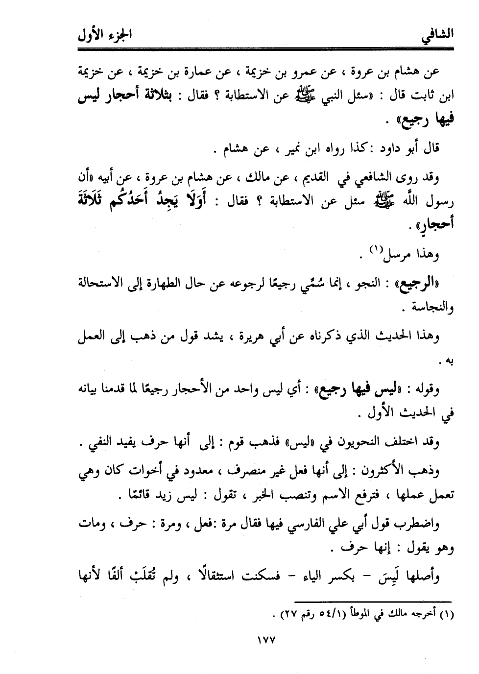 وقد روى الشافعي في القديم، عن مالك، عن هشام بن عروة، عن أبيه "أن رسول اللَّه - صلى الله عليه وسلم - سئل عن الاستطابة؟ فقال: أَوَلَا يَجِدُ أَحَدُكُم ثَلَاثَةَ أحجارٍ".