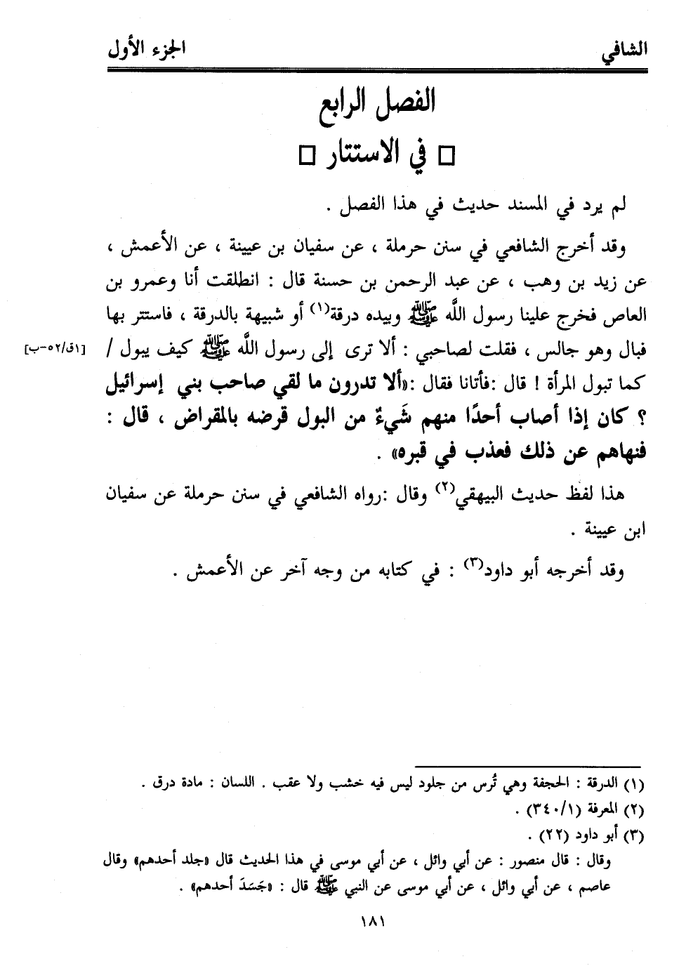 وقد أخرج الشافعي في سنن حرملة، عن سفيان بن عيينة، عن الأعمش، عن زيد بن وهب، عن عبد الرحمن بن حسنة قال: انطلقت أنا وعمرو بن العاص فخرج علينا رسول اللَّه - صلى الله عليه وسلم - وبيده درقة (¬1) أو شبيهة بالدرقة، فاستتر بها فبال وهو جالس، فقلت لصاحبي: ألا ترى إلى رسول اللَّه - صلى الله عليه وسلم - كيف يبول كما تبول المرأة! قال: فأتانا فقال: "ألا تدرون ما لقي صاحب بني إسرائيل؟ كان إذا أصاب أحدًا منهم شَيءٌ من البول قرضه بالمقراض، قال: فنهاهم عن ذلك فعذب في قبره".
