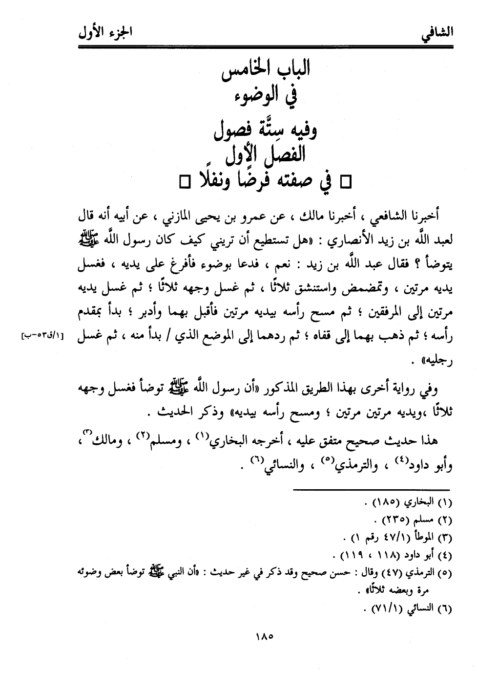 أخبرنا الشافعي، أخبرنا مالك، عن عمرو بن يحيى المازني، عن أبيه أنه قال لعبد اللَّه بن زيد الأنصاري: "هل تستطيع أن تريني كيف كان رسول اللَّه - صلى الله عليه وسلم - يتوضأ؟ فقال عبد اللَّه بن زيد: نعم، فدعا بوضوء فأفرغ على يديه، فغسل يديه مرتين، وتمضمض واستنشق ثلاثًا، ثم غسل وجهه ثلاثًا؛ ثم غسل يديه مرتين إلى المرفقين؛ ثم مسح رأسه بيديه مرتين فأقبل بهما وأدبر؛ بدأ بمقدم رأسه؛ ثم ذهب بهما إلى قفاه؛ ثم ردهما إلى الموضع الذي بدأ منه، ثم غسل رجليه".