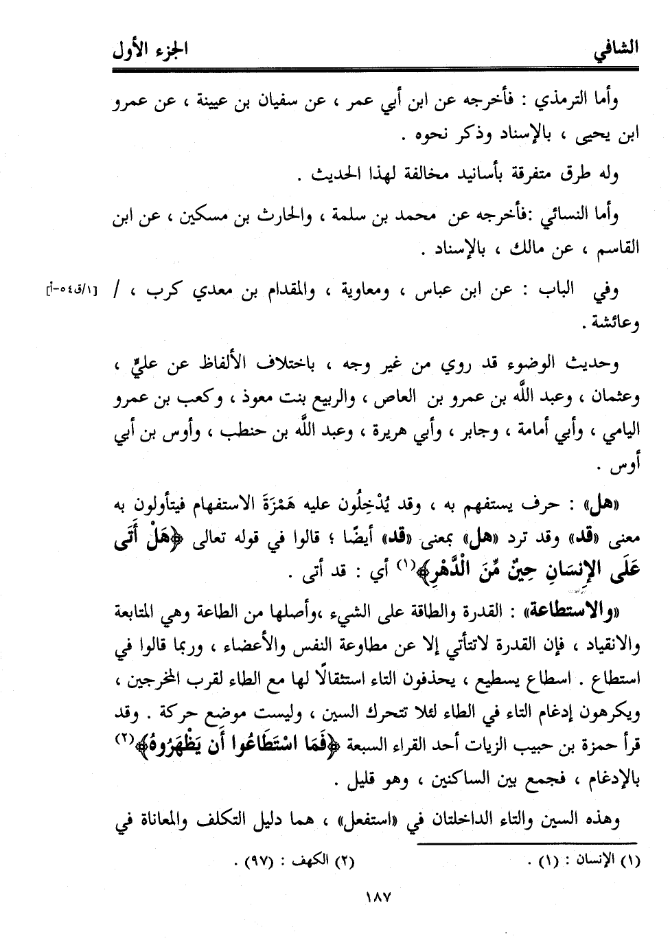 "والاستطاعة": القدرة والطاقة على الشيء، وأصلها من الطاعة وهي المتابعة والانقياد، فإن القدرة لا تتأتي إلا عن مطاوعة النفس والأعضاء، وربما قالوا في استطاع. اسطاع يسطيع، يحذفون التاء استثقالًا لها مع الطاء لقرب المخرجين، ويكرهون إدغام التاء في الطاء لئلا تتحرك السين، وليست موضع حركة. وقد قرأ حمزة بن حبيب الزيات أحد القراء السبعة {فَمَا اسْتَطَاعُوا أَن يَظْهَرُوهُ} (¬2) بالإدغام، فجمع بين الساكنين، وهو قليل.