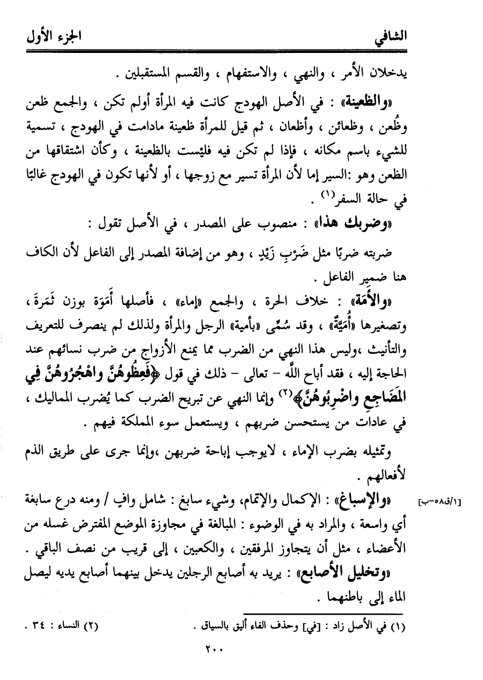 "والأَمَة": خلاف الحرة، والجمع "إماء"، فأصلها أَمَوَة بوزن ثَمَرةَ، وتصغيرها "أُمَيَّةٌ"، وقد سُمِّى "بأمية" الرجل والمرأة ولذلك لم ينصرف للتعريف والتأنيث، وليس هذا النهي من الضرب مما يمنع الأزواج من ضرب نسائهم عند الحاجة إليه، فقد أباح اللَّه -تعالى- ذلك في قول {فَعِظُوهُنَّ وَاهْجُرُوهُنَّ فِي الْمَضَاجِعِ وَاضْرِبُوهُنَّ} (¬2) وإنما النهي عن تبريح الضرب كما يُضرب المماليك،