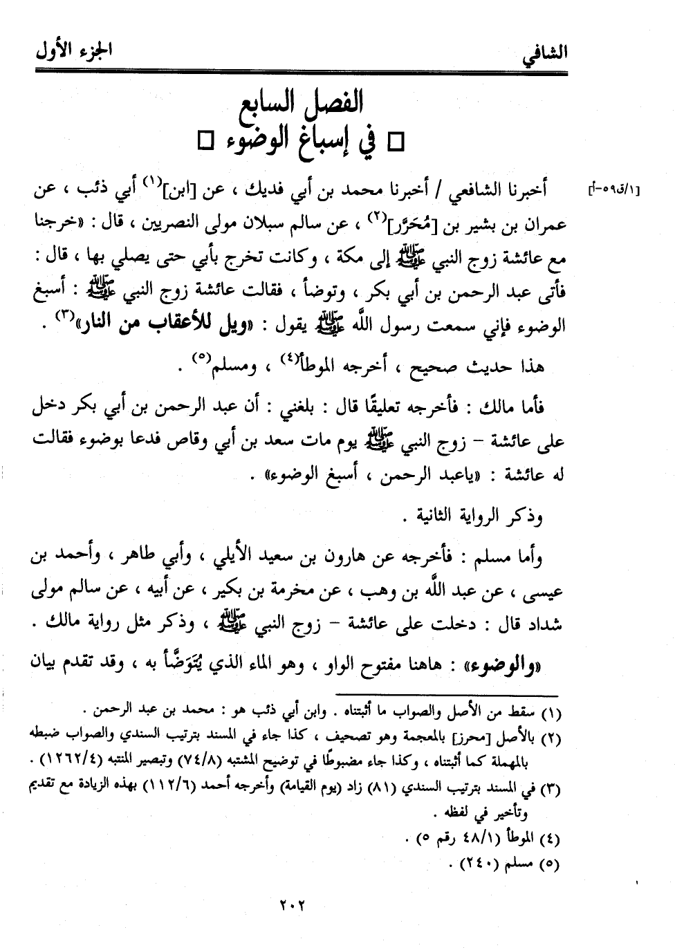 أخبرنا الشافعي أخبرنا محمد بن أبي فديك، عن [ابن] (¬1) أبي ذئب، عن عمران بن بشير بن [مُحَرَّر] (¬2)، عن سالم سبلان مولى النصريين، قال: "خرجنا مع عائشة زوج النبي - صلى الله عليه وسلم - إلى مكة، وكانت تخرج بأبي حتى يصلي بها، قال: فأتى عبد الرحمن بن أبي بكر، وتوضأ، فقالت عائشة زوج النبي - صلى الله عليه وسلم -: أسبغ الوضوء فإني سمعت رسول اللَّه - صلى الله عليه وسلم - يقول: "ويل للأعقاب من النار" (¬3).