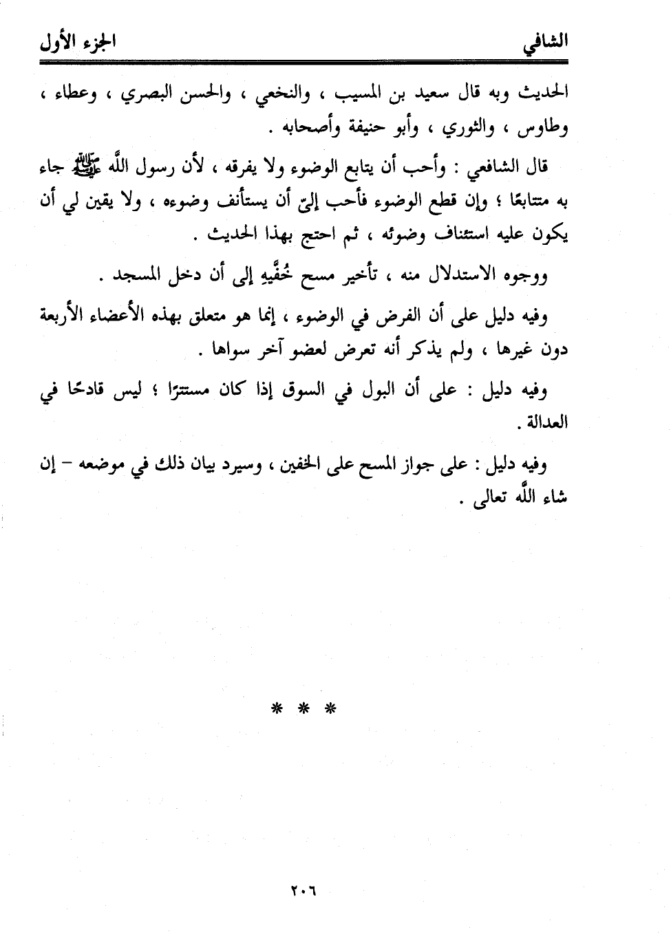 قال الشافعي: وأحب أن يتابع الوضوء ولا يفرقه، لأن رسول اللَّه - صلى الله عليه وسلم - جاء به متتابعًا؛ وإن قطع الوضوء فأحب إليّ أن يستأنف وضوءه، ولا يقين لي أن يكون عليه استئناف وضوئه، ثم احتج بهذا الحديث.