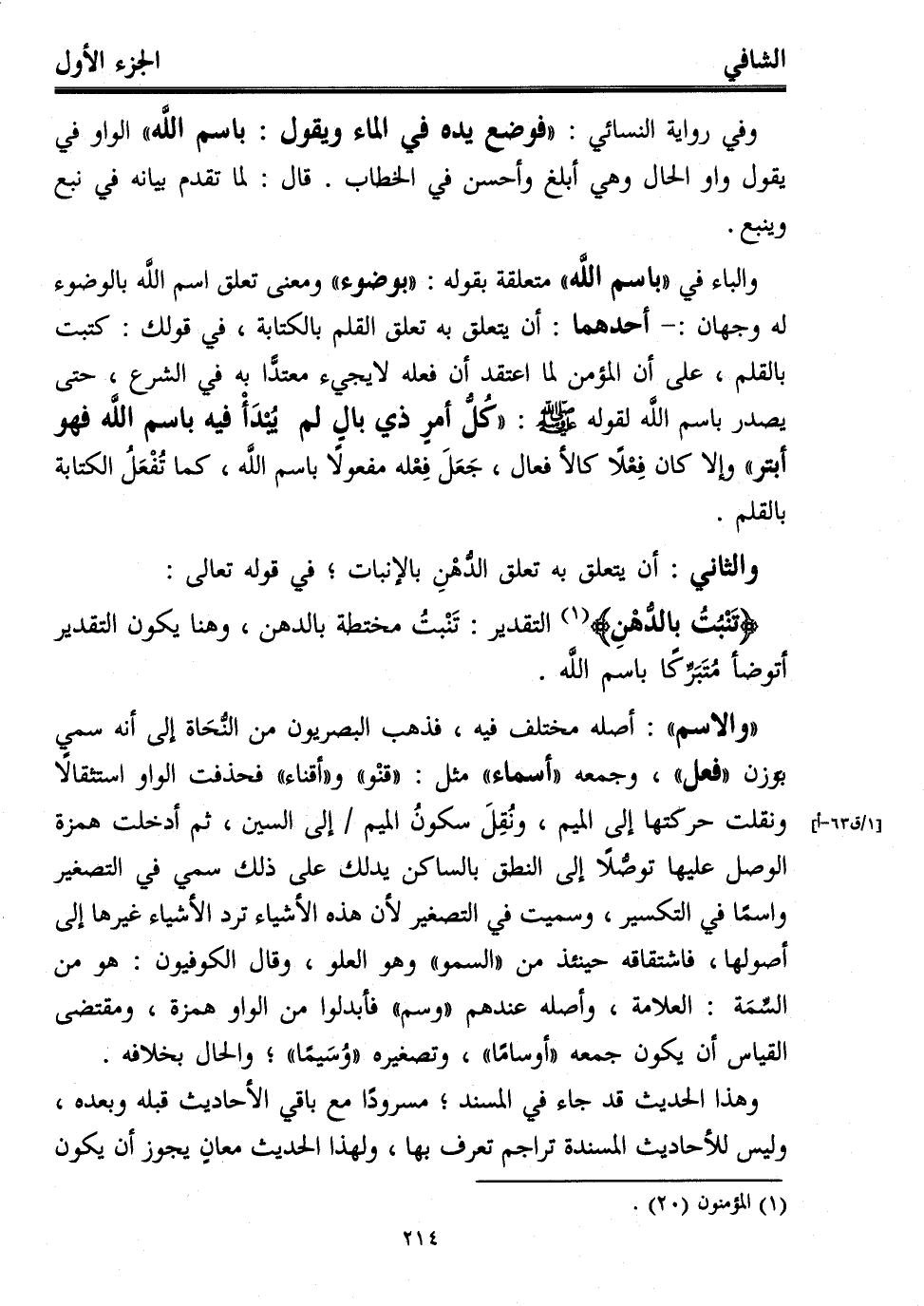 والباء في "باسم اللَّه" متعلقة بقوله: "بوضوء" ومعنى تعلق اسم اللَّه بالوضوء له وجهان:- أحدهما: أن يتعلق به تعلق القلم بالكتابة، في قولك: كتبت بالقلم، على أن المؤمن لما اعتقد أن فعله لا يجيء معتدًّا به في الشرع، حتى يصدر باسم اللَّه لقوله - صلى الله عليه وسلم -: "كُلُّ أمرٍ ذي بالٍ لم يُبْدَأْ فيه باسم اللَّه فهو أبتر" وإلا كان فِعْلًا كالأ فعال، جَعَلَ فِعْله مفعولًا باسم اللَّه، كما تُفْعَلُ الكتابة بالقلم.