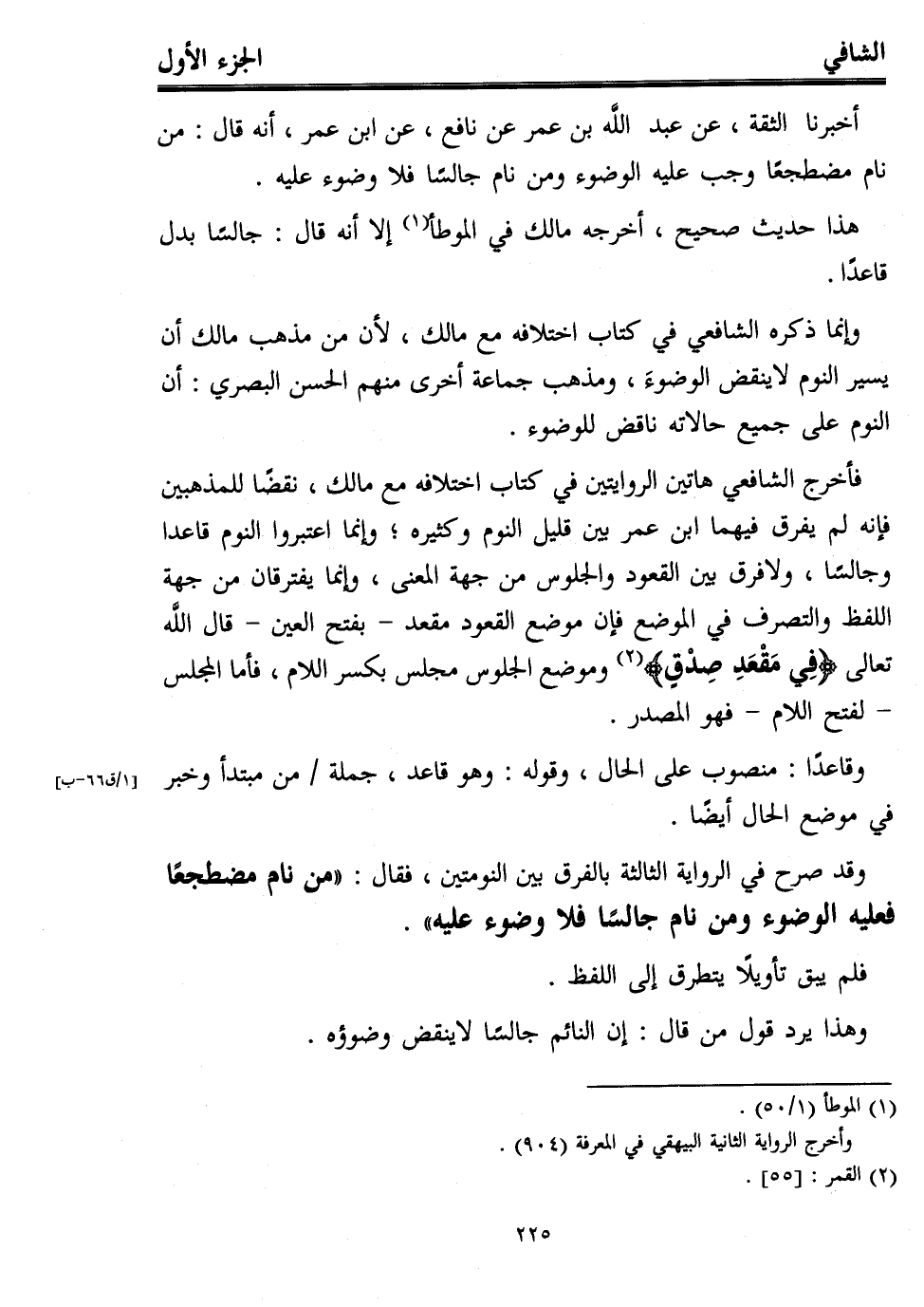فأخرج الشافعي هاتين الروايتين في كتاب اختلافه مع مالك، نقضًا للمذهبين فإنه لم يفرق فيهما ابن عمر بين قليل النوم وكثيره؛ وإنما اعتبروا النوم قاعدا وجالسًا, ولا فرق بين القعود والجلوس من جهة المعنى، وإنما يفترقان من جهة اللفظ والتصرف في الموضع فإن موضع القعود مقعد -بفتح العين- قال اللَّه تعالى (فِي مَقْعَدِ صِدْقٍ) (¬2) وموضع الجلوس مجلس بكسر اللام، فأما المجلس -لفتح اللام- فهو المصدر.