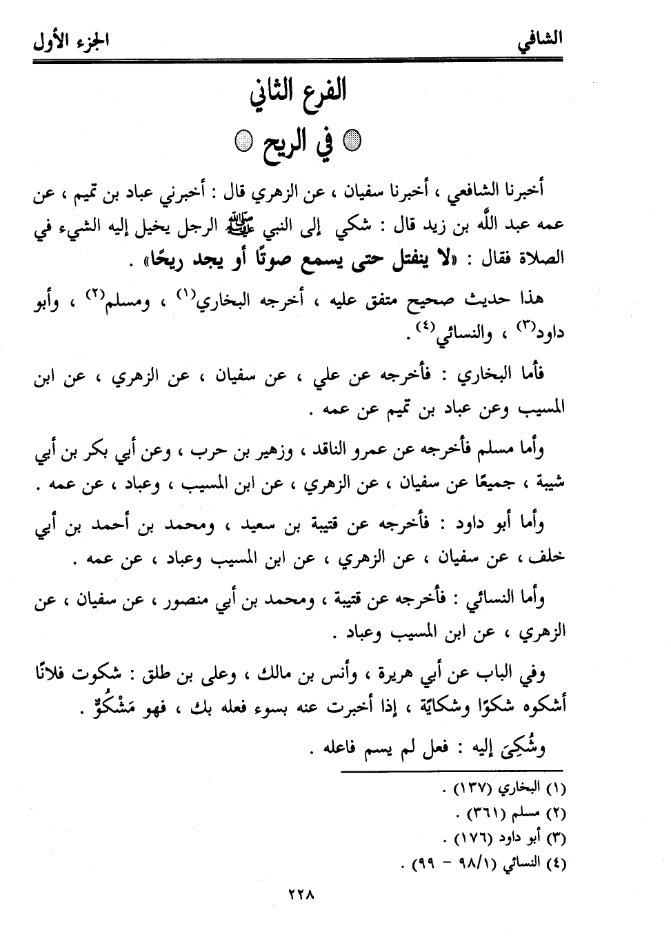 أخبرنا الشافعي، أخبرنا سفيان، عن الزهري قال: أخبرني عباد بن تميم، عن عمه عبد اللَّه بن زيد قال: شكي إلى النبي - صلى الله عليه وسلم - الرجل يخيل إليه الشيء في الصلاة فقال: "لا ينفتل حتى يسمع صوتًا أو يجد ريحًا".