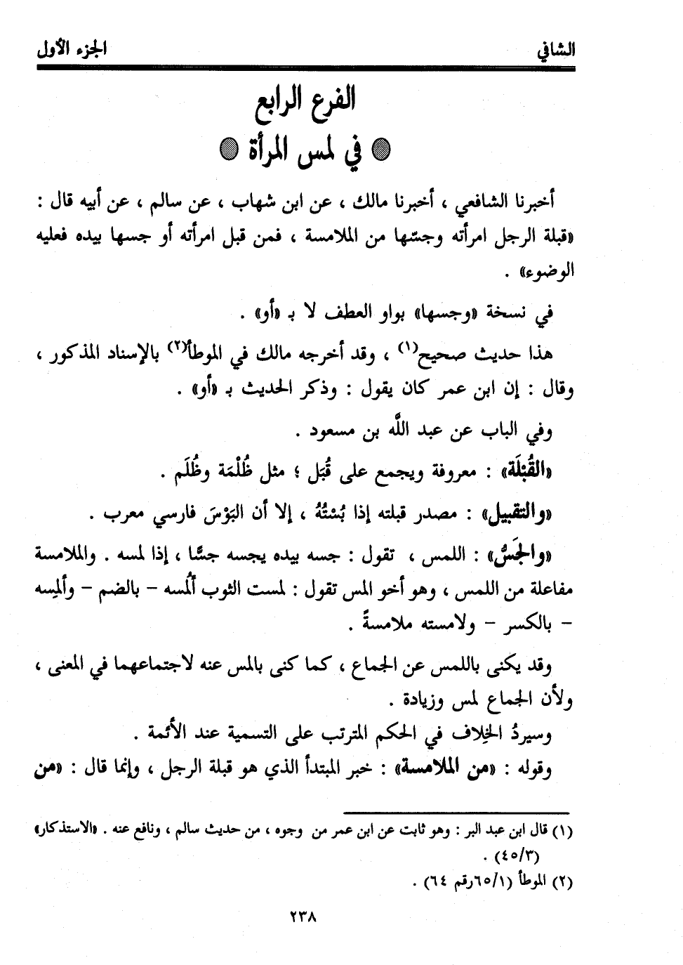 أخبرنا الشافعي، أخبرنا مالك، عن ابن شهاب، عن سالم، عن أبيه قال: "قبلة الرجل امرأته وجسّها من الملامسة، فمن قبل امرأته أو جسها بيده فعليه الوضوء".