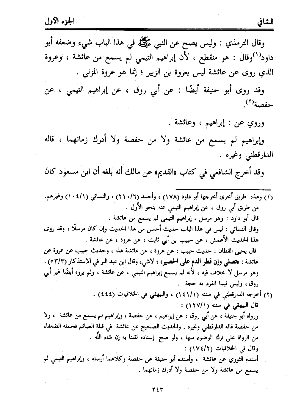 ورواه أبو حنيفة، عن أبي روق، عن إبراهيم، عن حفصة، وإبراهيم لم يسمع من عائشة، ولا من حفصة قاله الدارقطني وغيره. والحديث الصحيح عن عائشة في قبلة الصائم فحمله الضعفاء من الرواة على ترك الوضوء منها, ولو صح إسناده لقلنا به إن شاء اللَّه.