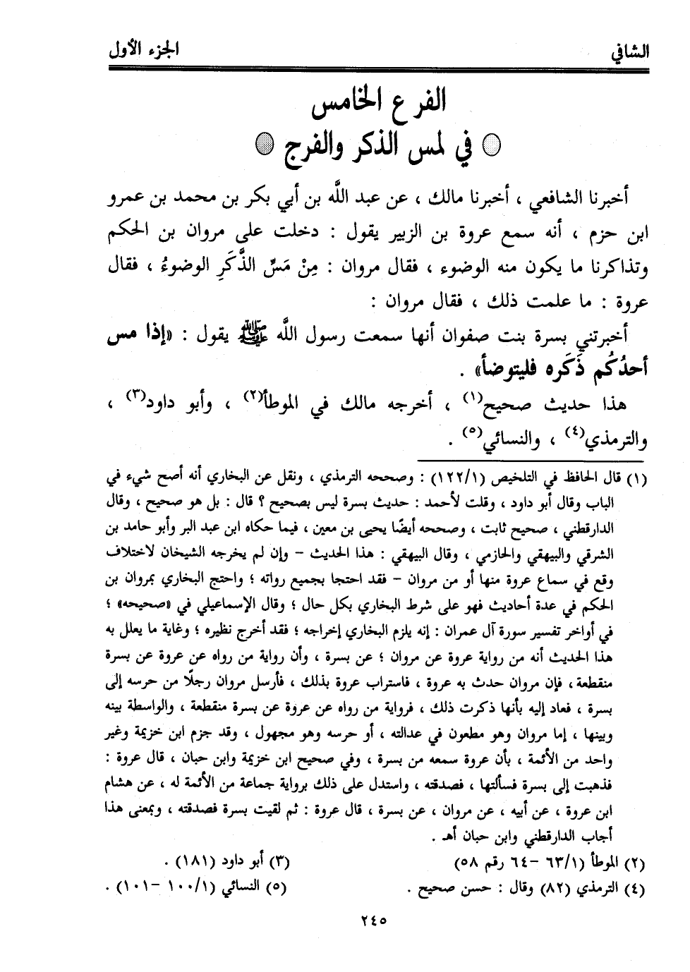 (¬1) قال الحافظ في التلخيص (1/ 122): وصححه الترمذي، ونقل عن البخاري أنه أصح شيء في الباب وقال أبو داود، وقلت لأحمد: حديث بسرة ليس بصحيح؟ قال: بل هو صحيح، وقال الدارقطني، صحيح ثابت، وصححه أيضًا يحيى بن معين، فيما حكاه ابن عبد البر وأبو حامد بن الشرقي والبيهقي والحازمي، وقال البيهقي: هذا الحديث -وإن لم يخرجه الشيخان لاختلاف وقع في سماع عروة منها أو من مروان- فقد احتجا بجميع رواته؛ واحتج البخاري بمروان بن الحكم في عدة أحاديث فهو على شرط البخاري بكل حال؛ وقال الإسماعيلي في "صحيحه"؛ في أواخر تفسير سورة آل عمران: إنه يلزم البخاري إخراجه؛ فقد أخرج نظيره؛ وغاية ما يعلل به هذا الحديث أنه من رواية عروة عن مروان؛ عن بسرة، وأن رواية من رواه عن عروة عن بسرة منقطعة، فإن مروان حدث به عروة، فاستراب عروة بذلك، فأرسل مروان رجلًا من حرسه إلى بسرة، فعاد إليه بأنها ذكرت ذلك، فرواية من رواه عن عروة عن بسرة منقطعة، والواسطة بينه وبينها، إما مروان وهو مطعون في عدالته، أو حرسه وهو مجهول، وقد جزم ابن خزيمة وغير واحد من الأئمة، بأن عروة سمعه من بسرة، وفي صحيح ابن خزيمة وابن حبان، قال عروة: فذهبت إلى بسرة فسألتها، فصدقته، واستدل على ذلك برواية جماعة من الأئمة له، عن هشام ابن عروة، عن أبيه، عن مروان، عن بسرة، قال عروة: ثم لقيت بسرة فصدقته، وبمعنى هذا أجاب الدارقطني وابن حبان أهـ.