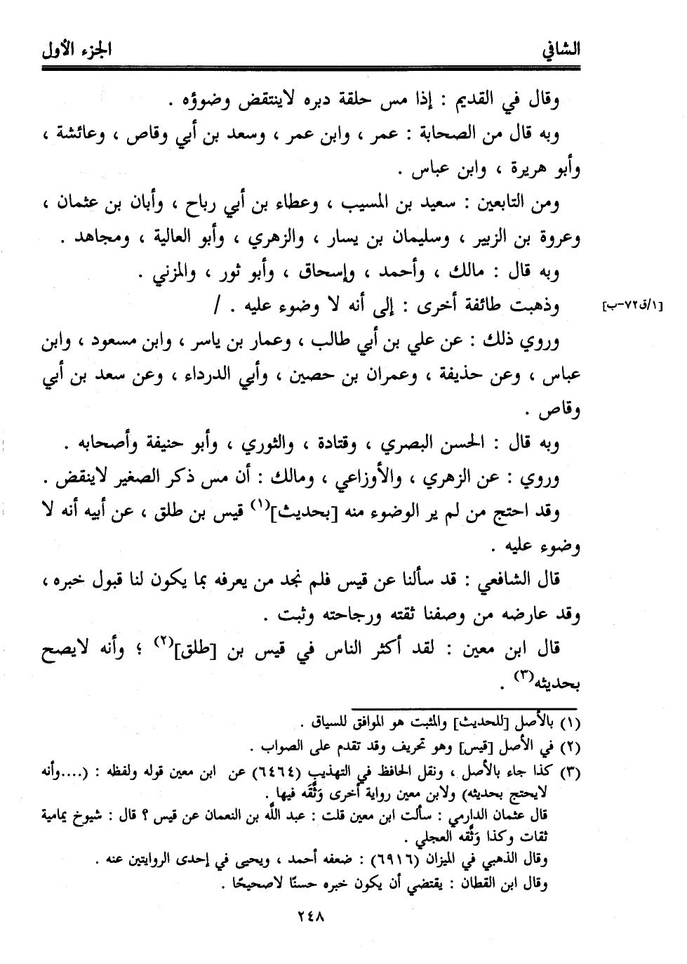 قال الشافعي: قد سألنا عن قيس فلم نجد من يعرفه بما يكون لنا قبول خبره، وقد عارضه من وصفنا ثقته ورجاحته وثبت.
