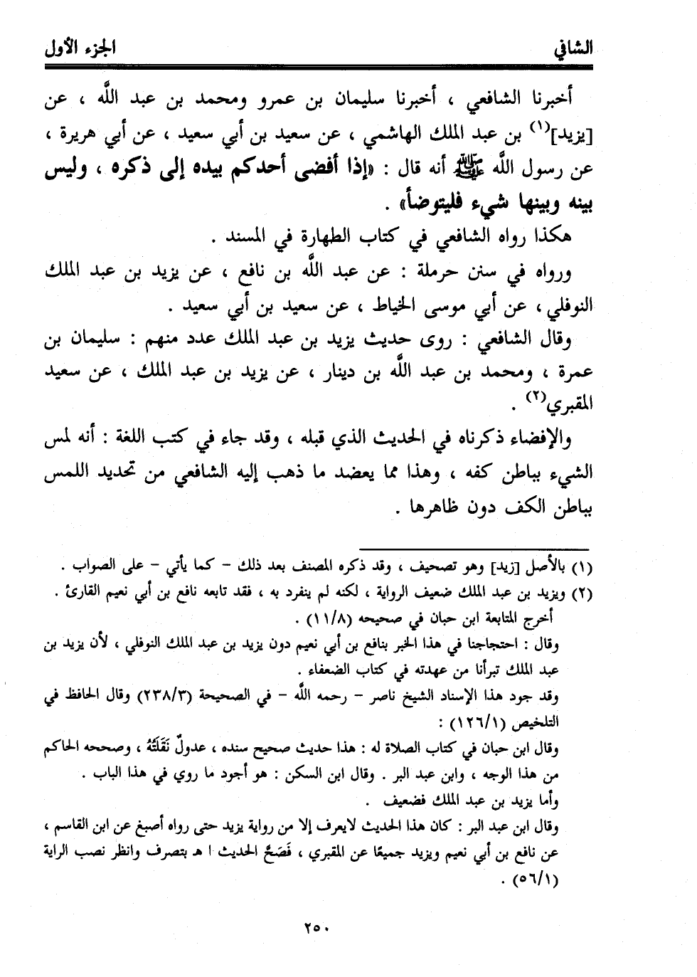 أخبرنا الشافعي، أخبرنا سليمان بن عمرو ومحمد بن عبد اللَّه، عن [يزيد] (¬1) بن عبد الملك الهاشمي، عن سعيد بن أبي سعيد، عن أبي هريرة، عن رسول اللَّه - صلى الله عليه وسلم - أنه قال: "إذا أفضى أحدكم بيده إلى ذكره، وليس بينه وبينها شيء فليتوضأ".