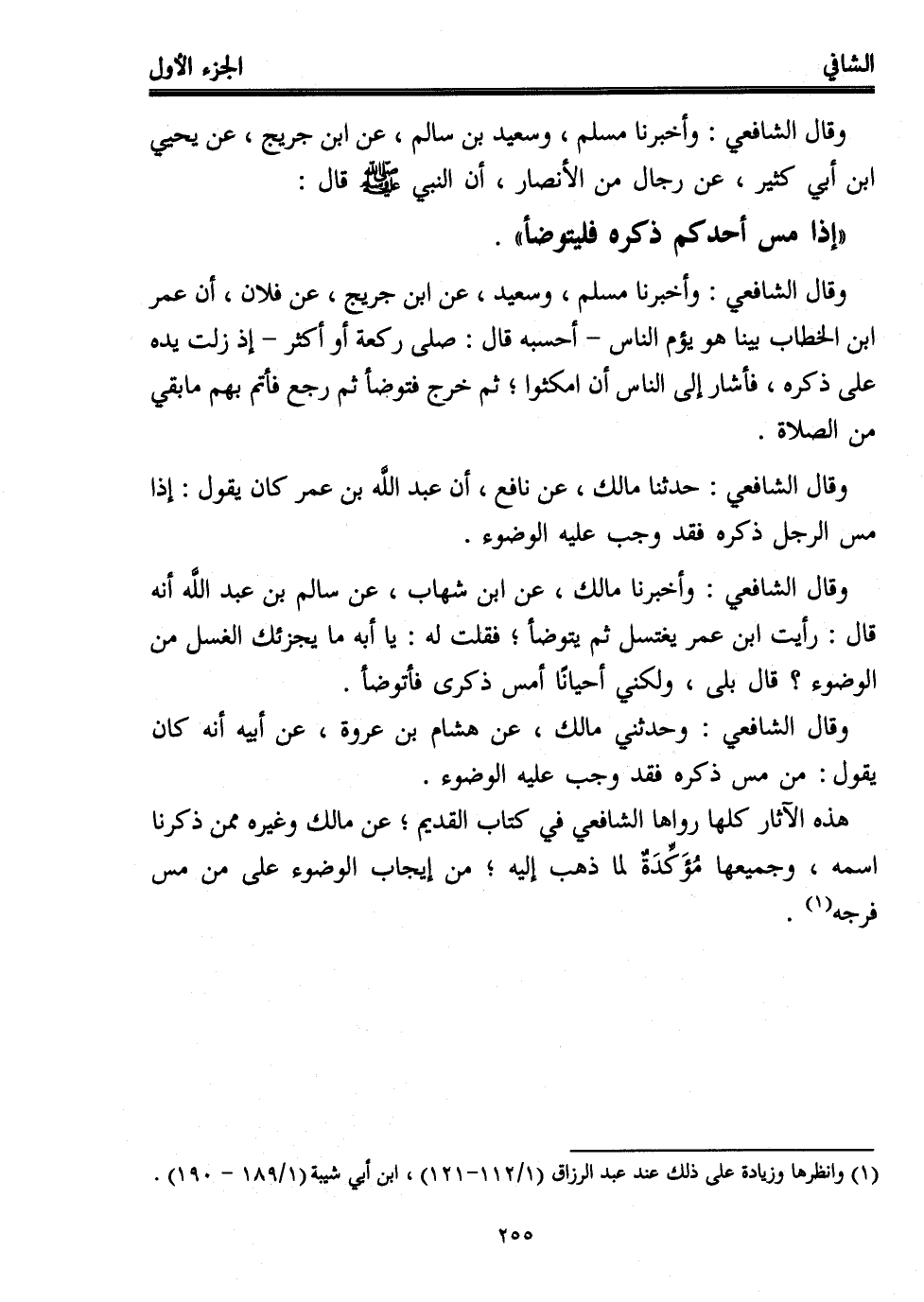 وقال الشافعي: حدثنا مالك، عن نافع، أن عبد اللَّه بن عمر كان يقول: إذا مس الرجل ذكره فقد وجب عليه الوضوء.