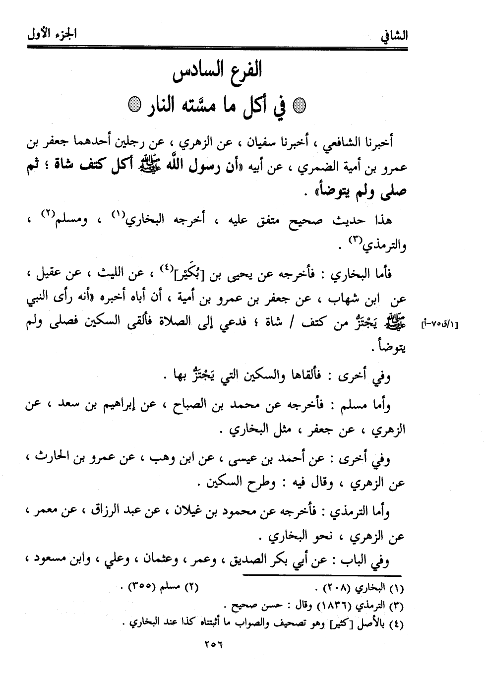 أخبرنا الشافعي، أخبرنا سفيان، عن الزهري، عن رجلين أحدهما جعفر بن عمرو بن أمية الضمري، عن أبيه "أن رسول اللَّه - صلى الله عليه وسلم - أكل كتف شاة؛ ثم صلى ولم يتوضأ".
