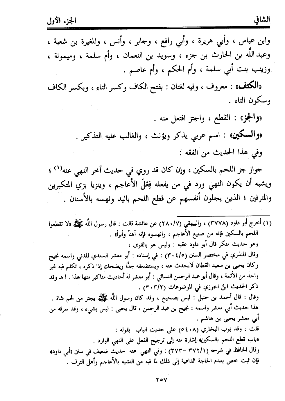 (¬1) أخرج أبو داود (3778)، والبيهقي (7/ 280) عن عائشة قالت: قال رسول اللَّه - صلى الله عليه وسلم - "لا تقطعوا اللحم بالسكين فإنه من صنيع الأعاجم، وانهسوه فإنه أهنأ وأبرأ".