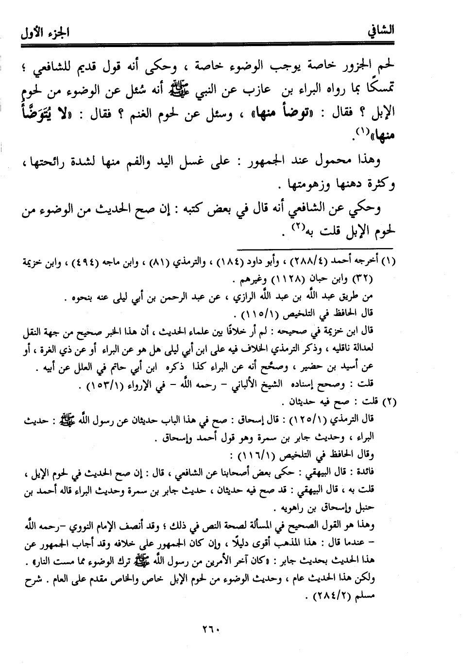 فائدة: قال البيهقي: حكى بعض أصحابنا عن الشافعي، قال: إن صح الحديث في لحوم الإبل، قلت به، قال البيهقي: قد صح فيه حديثان، حديث جابر بن سمرة وحديث البراء قاله أحمد بن حنبل وإسحاق بن راهويه.
