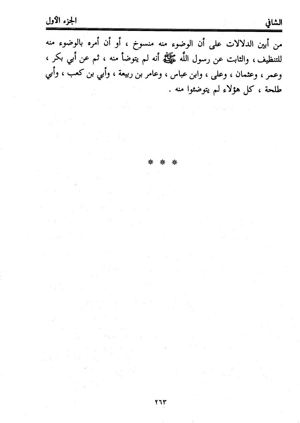 من أبين الدلالات على أن الوضوء منه منسوخ، أو أن أمره بالوضوء منه للتنظيف، والثابت عن رسول اللَّه - صلى الله عليه وسلم - أنه لم يتوضأ منه، ثم عن أبي بكر، وعمر، وعثمان، وعلي، وابن عباس، وعامر بن ربيعة، وأبي بن كعب، وأبي طلحة، كل هؤلاء لم يتوضئوا منه.