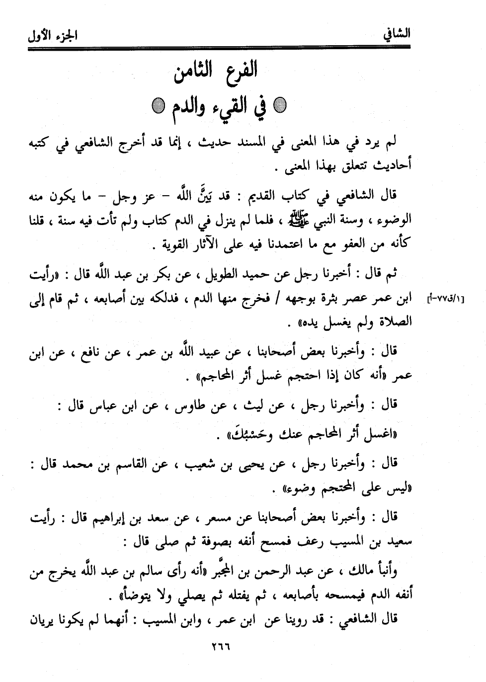 قال الشافعي في كتاب القديم: قد بَينَّ اللَّه -عز وجل- ما يكون منه الوضوء، وسنة النبي - صلى الله عليه وسلم -، فلما لم ينزل في الدم كتاب ولم تأت فيه سنة، قلنا كأنه من العفو مع ما اعتمدنا فيه على الآثار القوية.