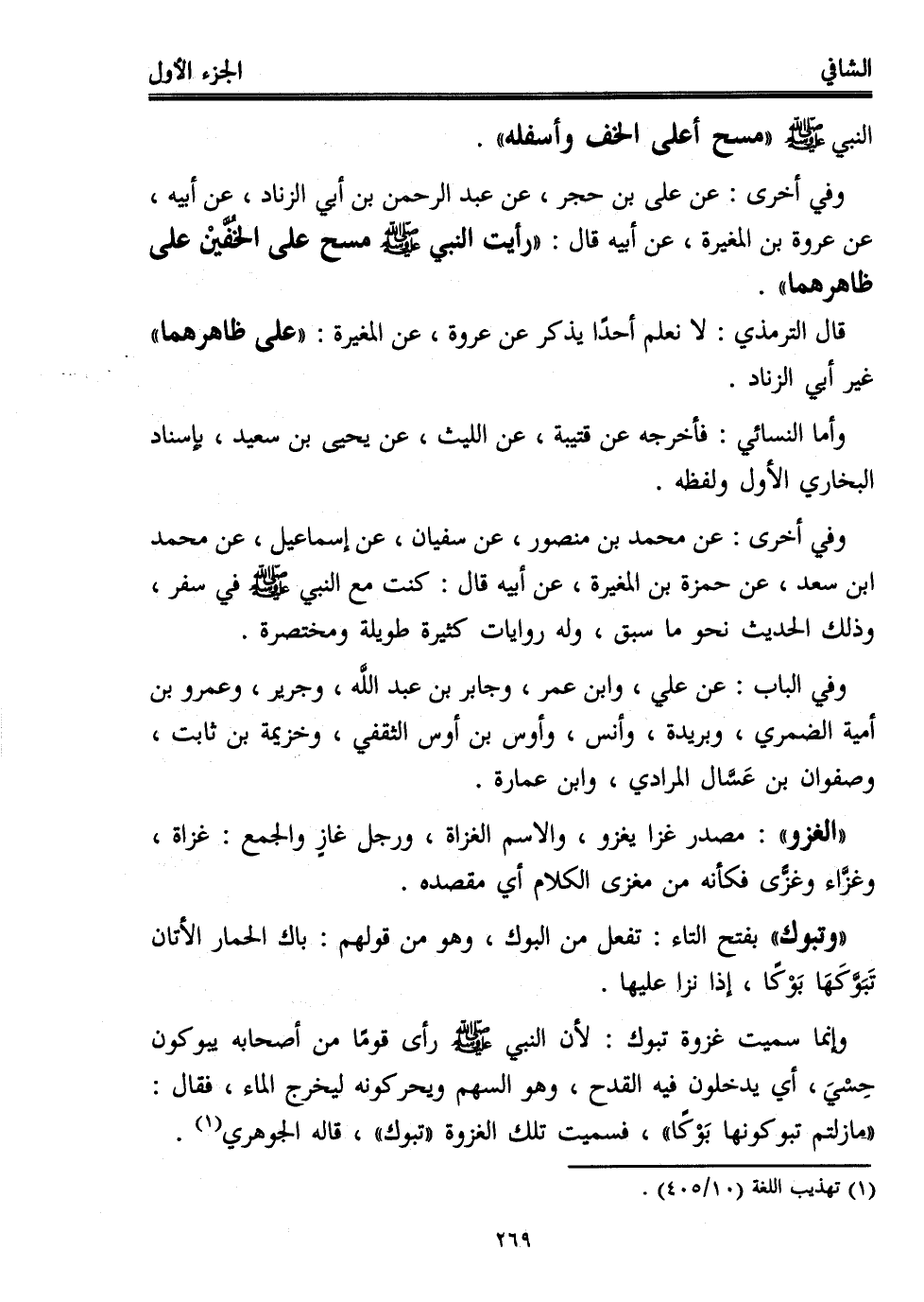 وفي أخرى: عن علي بن حجر، عن عبد الرحمن بن أبي الزناد، عن أبيه، عن عروة بن المغيرة، عن أبيه قال: "رأيت النبي - صلى الله عليه وسلم - مسح على الخُفَّيْن على ظاهرهما".