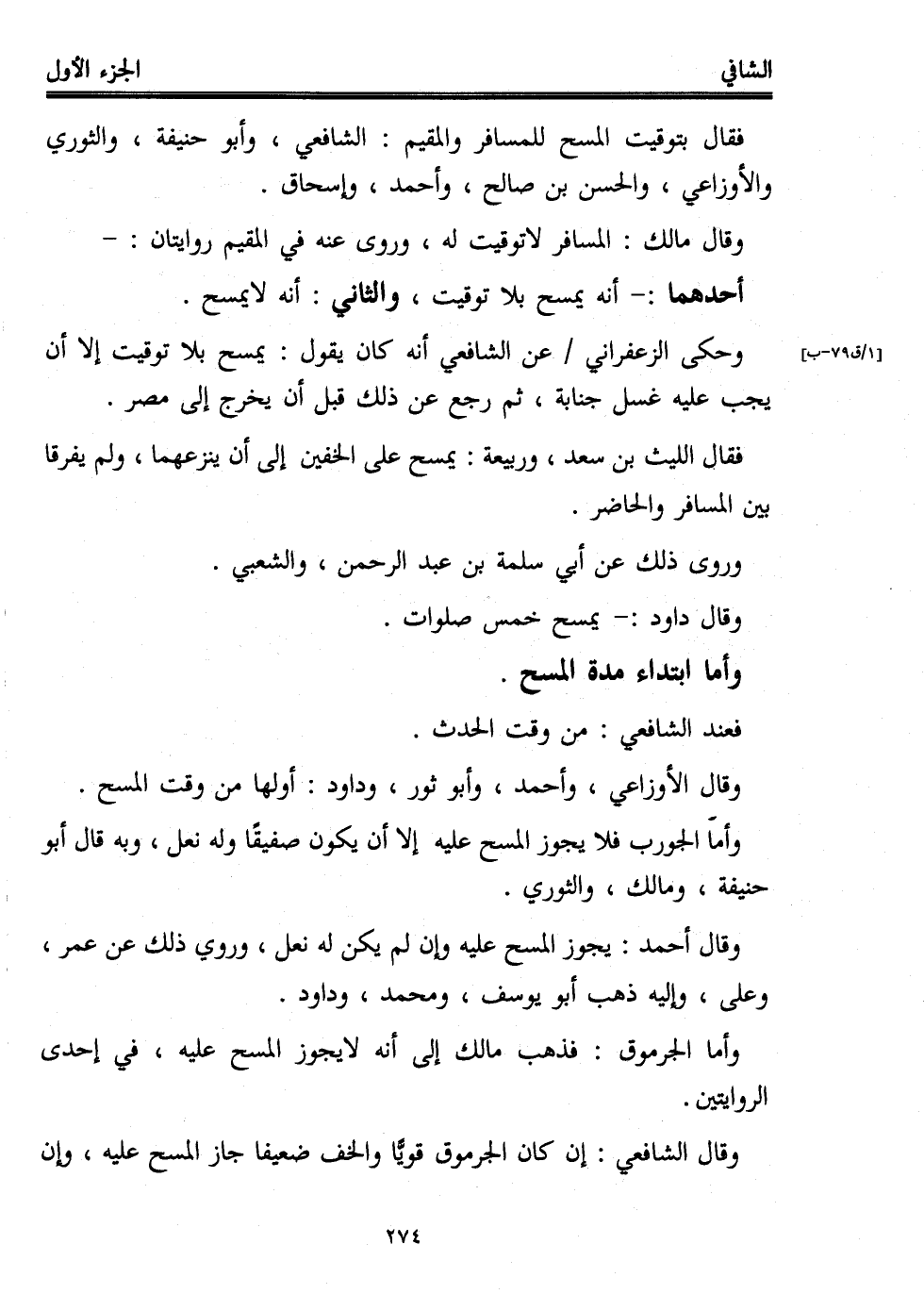 فقال بتوقيت المسح للمسافر والمقيم: الشافعي، وأبو حنيفة، والثوري والأوزاعي، والحسن بن صالح، وأحمد، وإسحاق.