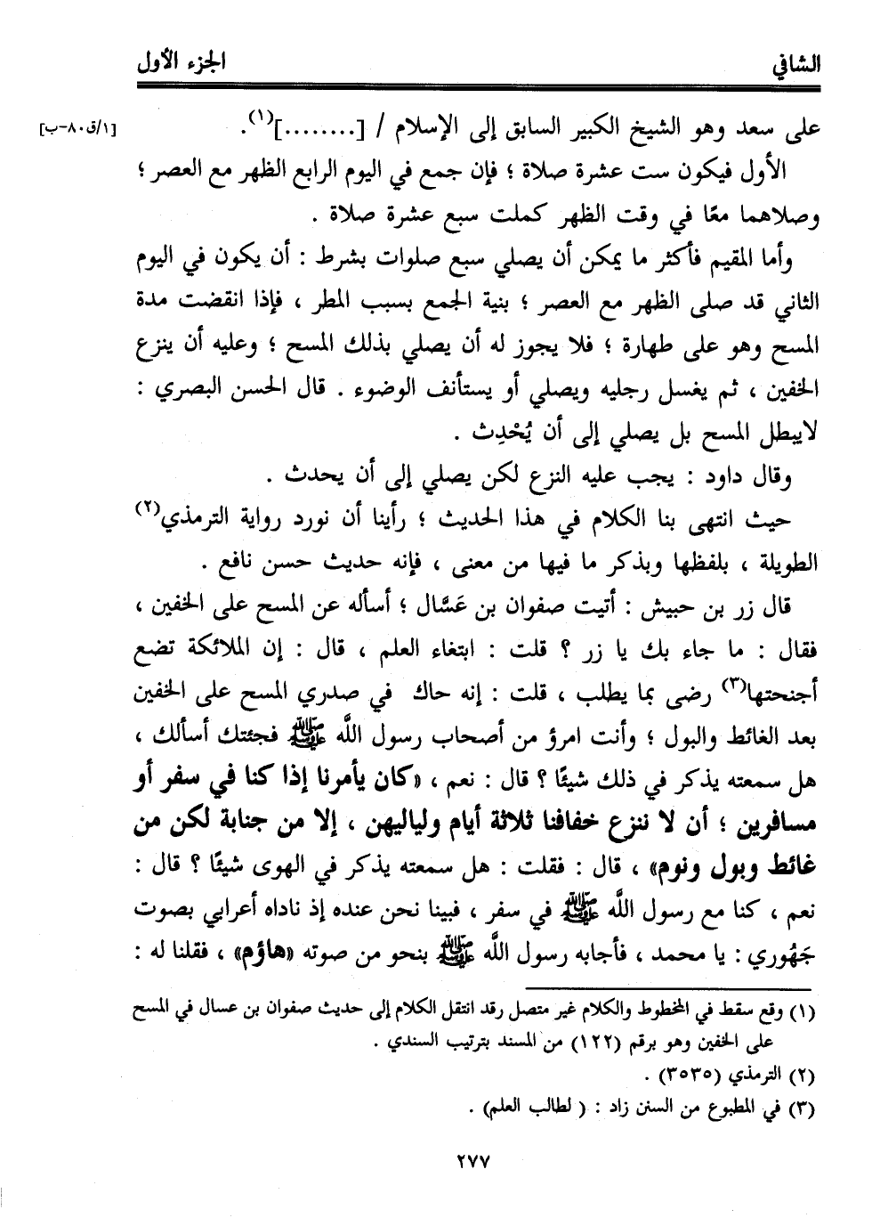 قال زر بن حبيش: أتيت صفوان بن عَسَّال؛ أسأله عن المسح على الخفين، فقال: ما جاء بك يازر؟ قلت: ابتغاء العلم، قال: إن الملائكة تضع أجنحتها (¬3) رضي بما يطلب، قلت: إنه حاك في صدري المسح على الخفين بعد الغائط والبول؛ وأنت امرؤ من أصحاب رسول اللَّه - صلى الله عليه وسلم - فجئتك أسألك، هل سمعته يذكر في ذلك شيئًا؟ قال: نعم، "كان يأمرنا إذا كنا في سفر أو مسافرين؛ أن لا ننزع خفافنا ثلاثة أيام ولياليهن، إلا من جنابة لكن من غائط وبول ونوم"، قال: فقلت: هل سمعته يذكر في الهوى شيئًا؟ قال: نعم، كنا مع رسول اللَّه - صلى الله عليه وسلم - في سفر، فبينا نحن عنده إذ ناداه أعرابي بصوت جَهُوري: يا محمد، فأجابه رسول اللَّه - صلى الله عليه وسلم - بنحو من صوته "هاؤم"، فقلنا له: