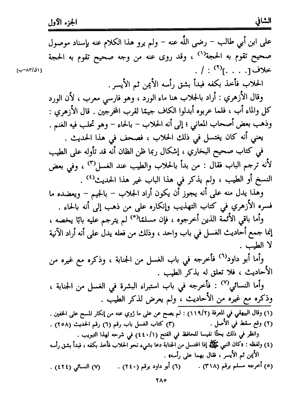 (¬4) ولفظه: "كان النبي - صلى الله عليه وسلم - إذا اغتسل من الجنابة دعا بشيء نحو الحلاب فأخذ بكفه، فبدأ بشق رأسه الأيمن ثم الأيسر، فقال بهما على رأسه".