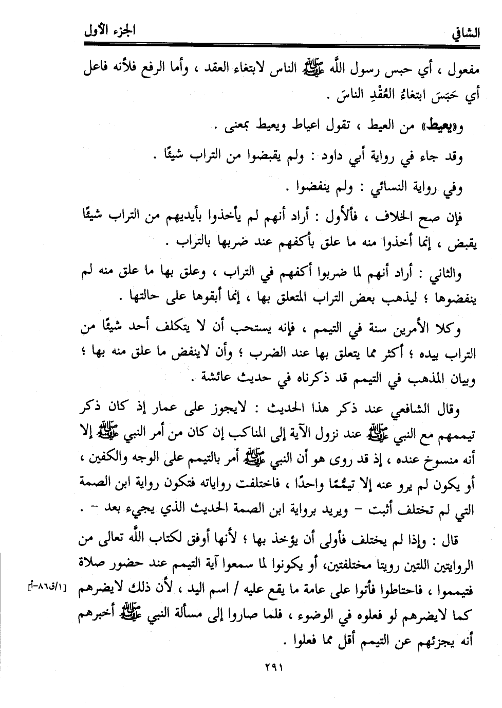 وقال الشافعي عند ذكر هذا الحديث: لا يجوز على عمار إذ كان ذكر تيممهم مع النبي - صلى الله عليه وسلم - عند نزول الآية إلى المناكب إن كان من أمر النبي - صلى الله عليه وسلم - إلا أنه منسوخ عنده، إذ قد روى هو أن النبي - صلى الله عليه وسلم - أمر بالتيمم على الوجه والكفين، أو يكون لم يرو عنه إلا تيمُّمًا واحدًا، فاختلفت رواياته فتكون رواية ابن الصمة التي لم تختلف أثبت -ويريد برواية ابن الصمة الحديث الذي يجيء بعد-.