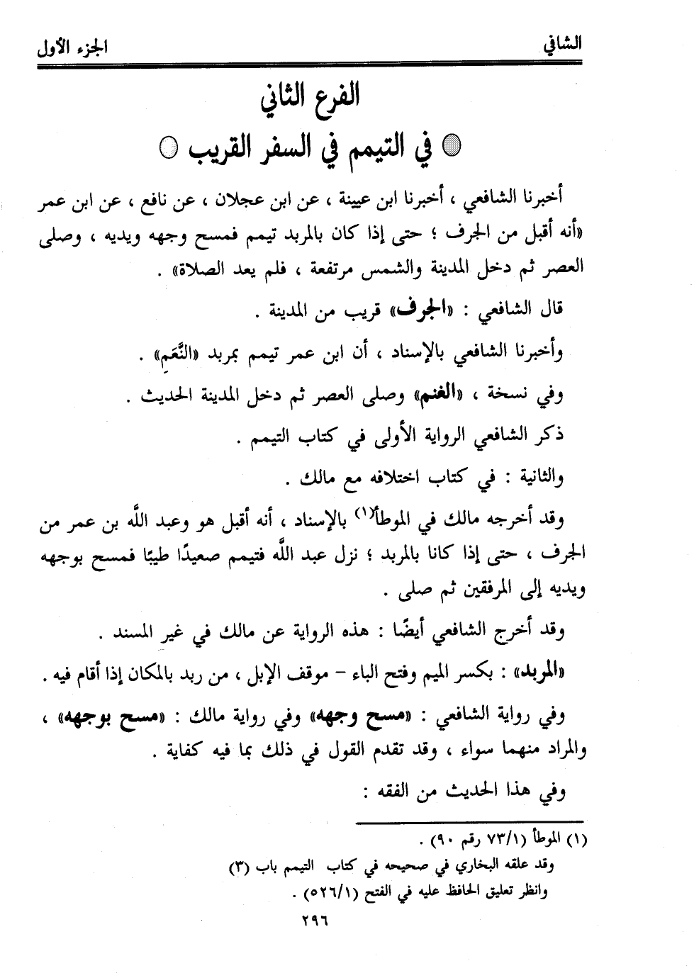 أخبرنا الشافعي، أخبرنا ابن عيينة، عن ابن عجلان، عن نافع، عن ابن عمر "أنه أقبل من الجرف؛ حتى إذا كان بالمربد تيمم فمسح وجهه ويديه، وصلى العصر ثم دخل المدينة والشمس مرتفعة، فلم يعد الصلاة".