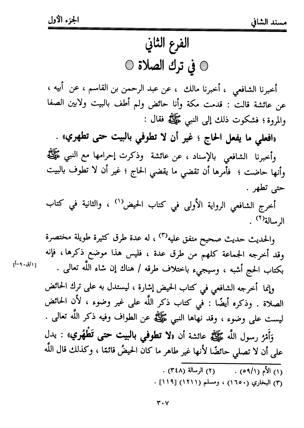 وأخبرنا الشافعي بالإسناد، عن عائشة وذكرت إحرامها مع النبي - صلى الله عليه وسلم - وأنها حاضت؛ فأمرها أن تقضي ما يقضي الحاج؛ غير أن لا تطوف بالبيت حتى تطهر.