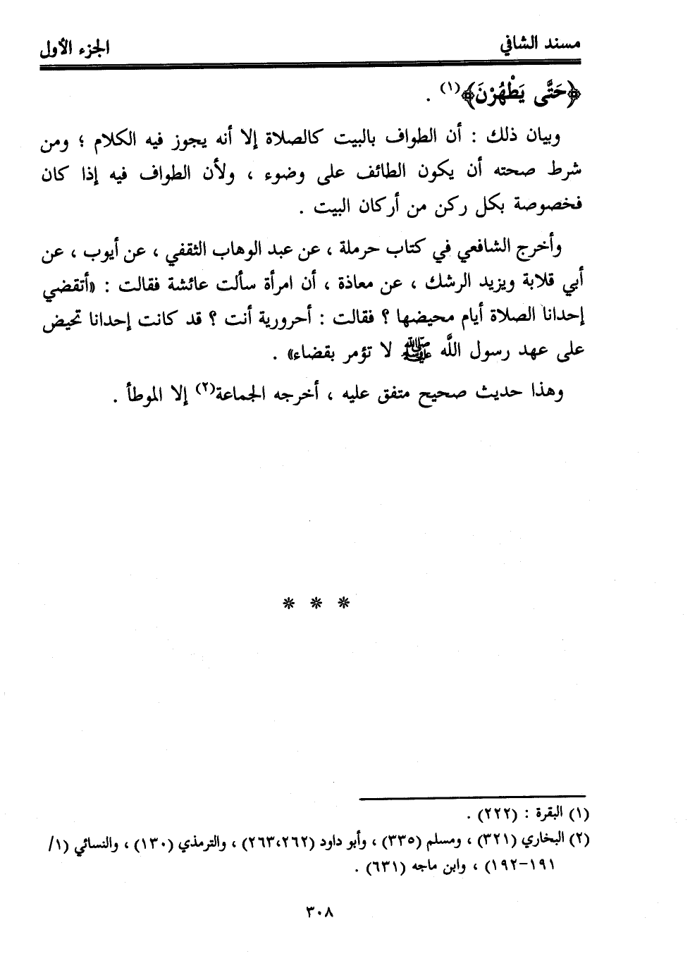 وأخرج الشافعي في كتاب حرملة، عن عبد الوهاب الثقفي، عن أيوب، عن أبي قلابة ويزيد الرشك، عن معاذة، أن امرأة سألت عائشة فقالت: "أتقضي إحدانا الصلاة أيام محيضها؟ فقالت: أحرورية أنت؟ قد كانت إحدانا تحيض على عهد رسول اللَّه - صلى الله عليه وسلم - لا تؤمر بقضاء".