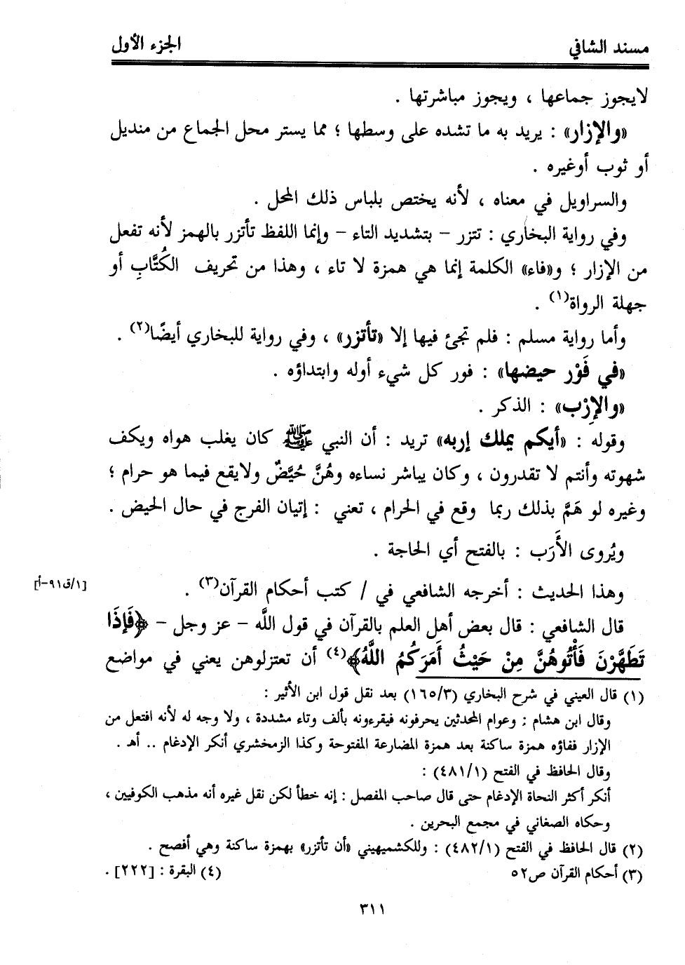 قال الشافعي: قال بعض أهل العلم بالقرآن في قول اللَّه -عز وجل- {فَإِذَا تَطَهَّرْنَ فَأْتُوهُنَّ مِنْ حَيْثُ أَمَرَكُمُ اللَّهُ} (¬4) أن تعتزلوهن يعني في مواضع