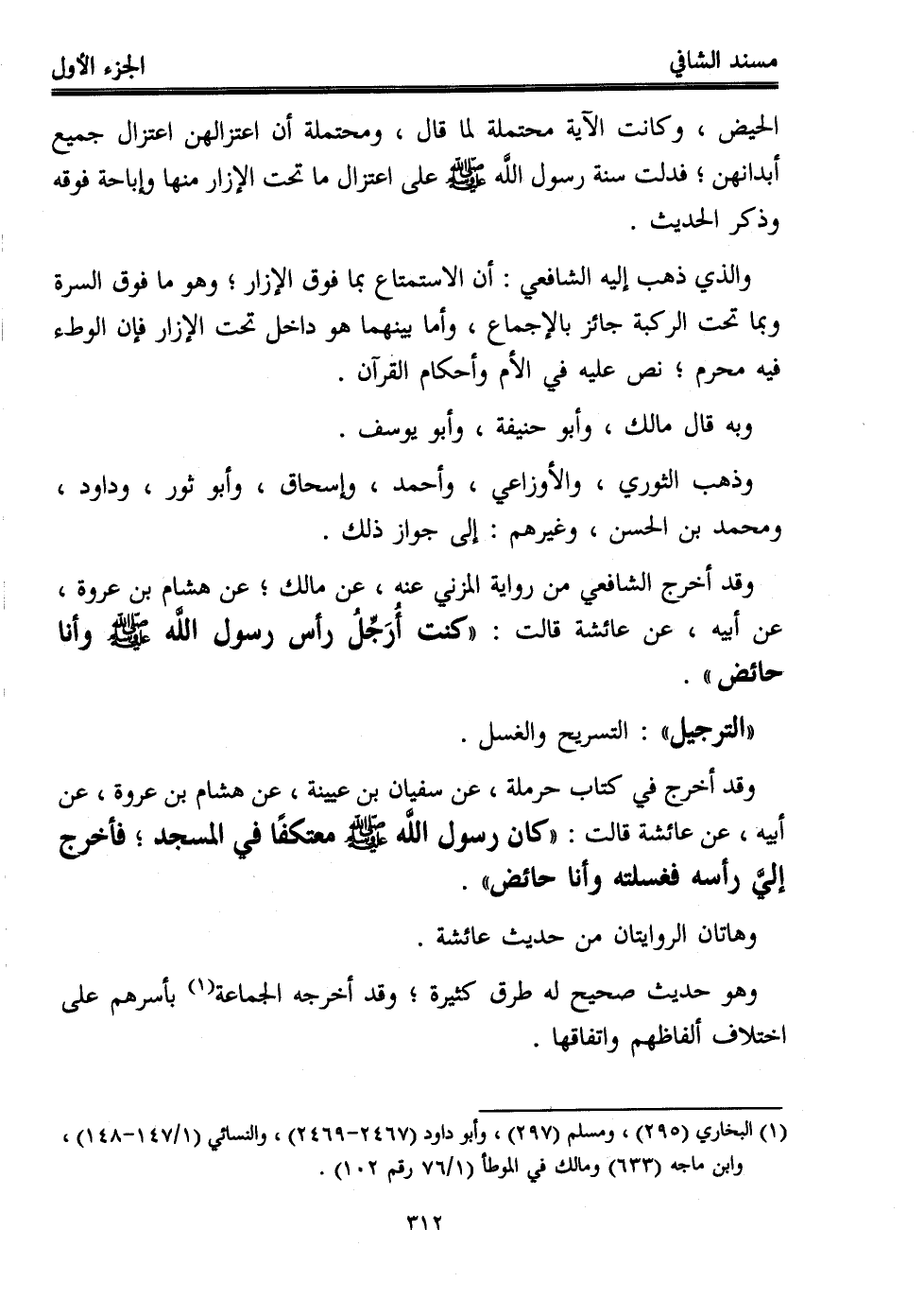 وقد أخرج الشافعي من رواية المزني عنه، عن مالك؛ عن هشام بن عروة، عن أبيه، عن عائشة قالت: "كنت أُرَجِّلُ رأس رسول اللَّه - صلى الله عليه وسلم - وأنا حائض".