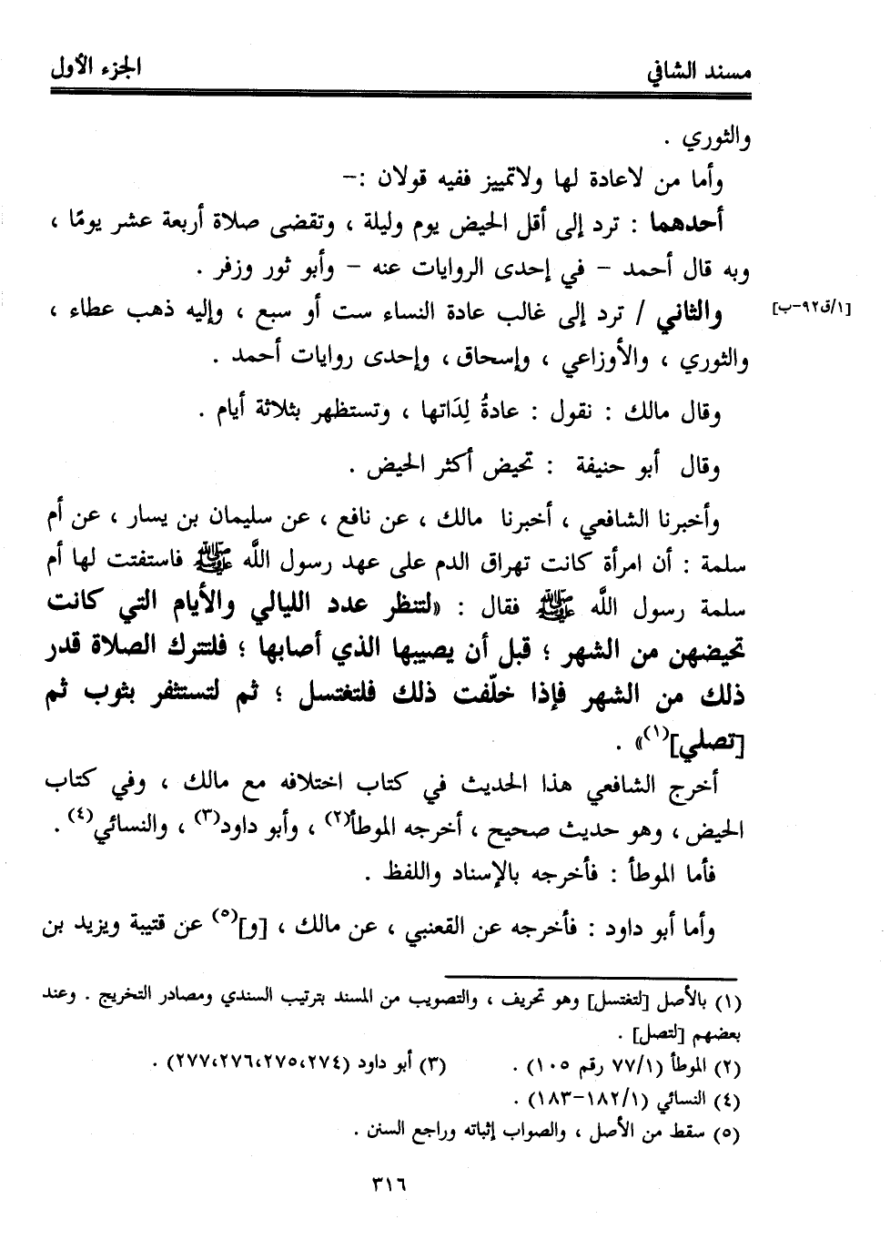 أخرج الشافعي هذا الحديث في كتاب اختلافه مع مالك، وفي كتاب الحيض، وهو حديث صحيح، أخرجه الموطأ (¬2)، وأبو داود (¬3)، والنسائي (¬4).