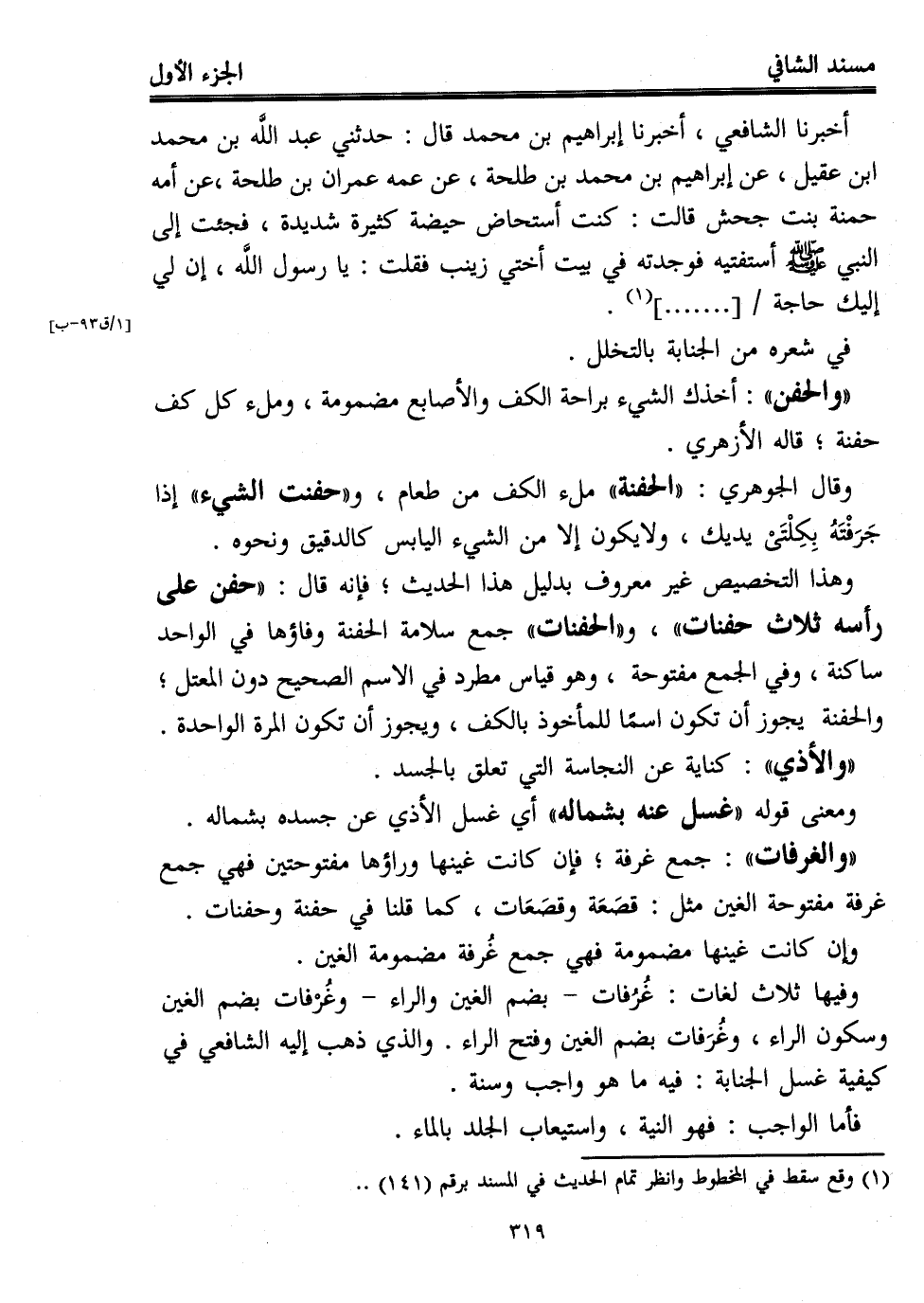 وفيها ثلاث لغات: غُرُفات -بضم الغين والراء- وغُرْفات بضم الغين وسكون الراء، وغُرَفات بضم الغين وفتح الراء. والذي ذهب إليه الشافعي في كيفية غسل الجنابة: فيه ما هو واجب وسنة.