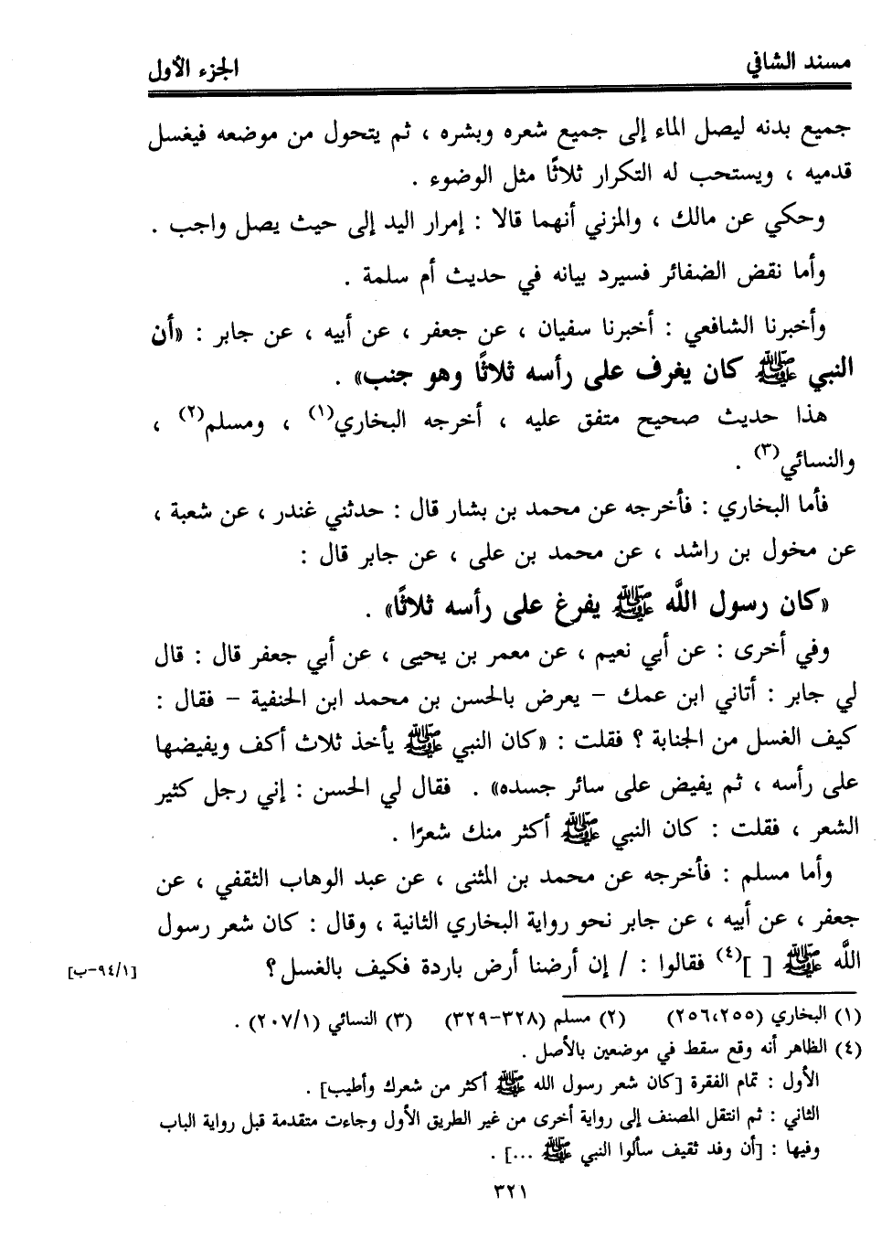وأخبرنا الشافعي: أخبرنا سفيان، عن جعفر، عن أبيه، عن جابر: "أن النبي - صلى الله عليه وسلم - كان يغرف على رأسه ثلاثًا وهو جنب".