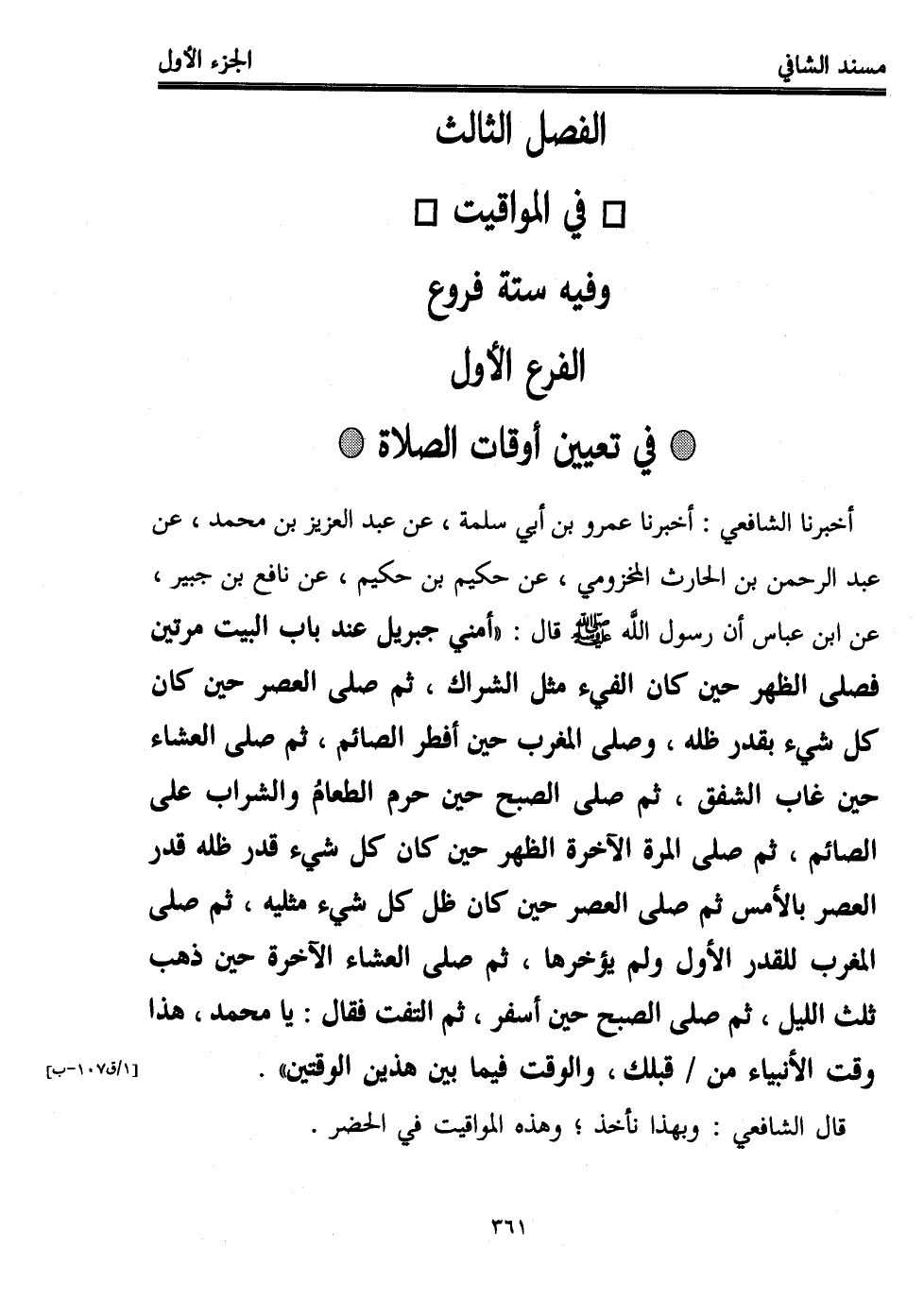 أخبرنا الشافعي: أخبرنا عمرو بن أبي سلمة، عن عبد العزيز بن محمد، عن عبد الرحمن بن الحارث المخزومي، عن حكيم بن حكيم، عن نافع بن جبير، عن ابن عباس أن رسول اللَّه - صلى الله عليه وسلم - قال: "أمني جبريل عند باب البيت مرتين فصلى الظهر حين كان الفيء مثل الشراك، ثم صلى العصر حين كان كل شيء بقدر ظله، وصلى المغرب حين أفطر الصائم، ثم صلى العشاء حين غاب الشفق، ثم صلى الصبح حين حرم الطعامُ والشراب على الصائم، ثم صلى المرة الآخرة الظهر حين كان كل شيء قدر ظله قدر العصر بالأمس ثم صلى العصر حين كان ظل كل شيء مثليه، ثم صلى المغرب للقدر الأول ولم يؤخرها، ثم صلى العشاء الآخرة حين ذهب ثلث الليل، ثم صلى الصبح حين أسفر، ثم التفت فقال: يا محمد، هذا وقت الأنبياء من قبلك، والوقت فيما بين هذين الوقتين".