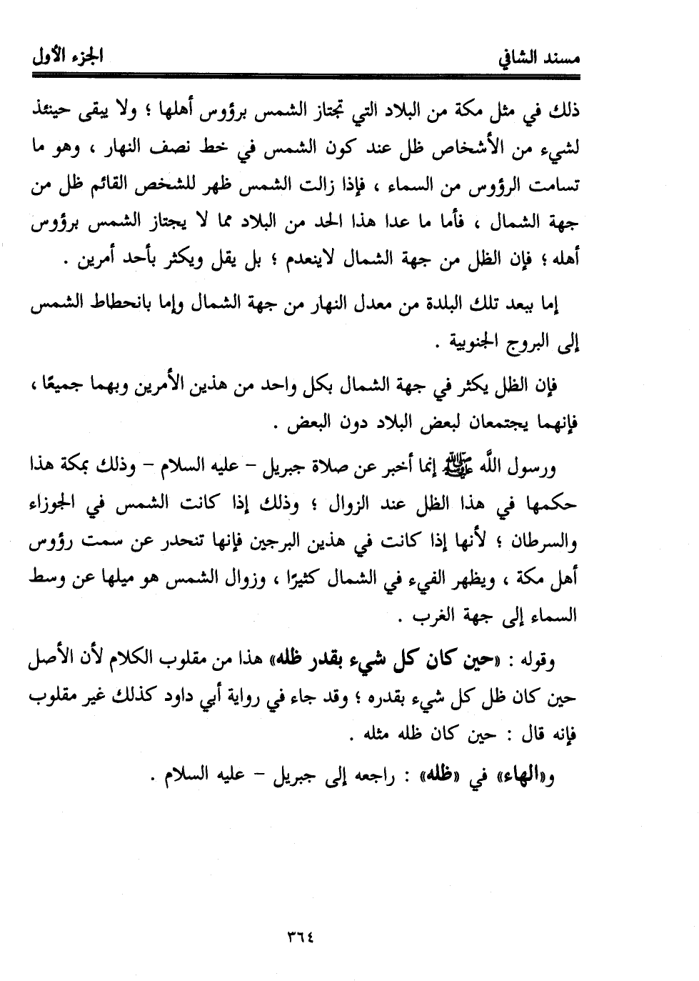 ورسول اللِّه - صلى الله عليه وسلم - إنما أخبر عن صلاة جبريل -عليه السلام- وذلك بمكة هذا حكمها في هذا الظل عند الزوال؛ وذلك إذا كانت الشمس في الجوزاء والسرطان؛ لأنها إذا كانت في هذين البرجين فإنها تنحدر عن سمت رؤوس أهل مكة، ويظهر الفيء في الشمال كثيرًا، وزوال الشمس هو ميلها عن وسط السماء إلى جهة الغرب.