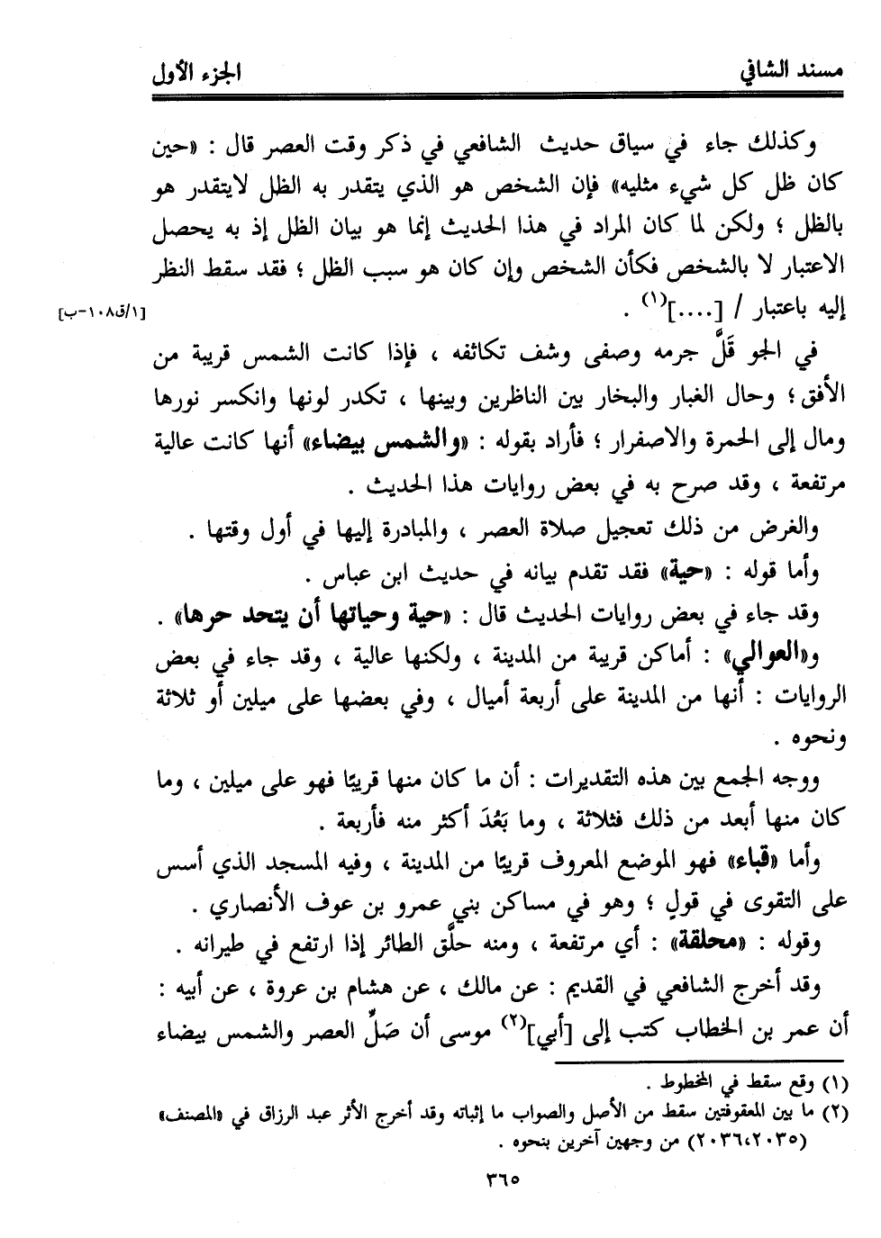 وكذلك جاء في سياق حديث الشافعي في ذكر وقت العصر قال: "حين كان ظل كل شيء مثليه" فإن الشخص هو الذي يتقدر به الظل لا يتقدر هو بالظل؛ ولكن لما كان المراد في هذا الحديث إنما هو بيان الظل إذ به يحصل الاعتبار لا بالشخص فكأن الشخص وإن كان هو سبب الظل؛ فقد سقط النظر إليه باعتبار [....] (¬1).