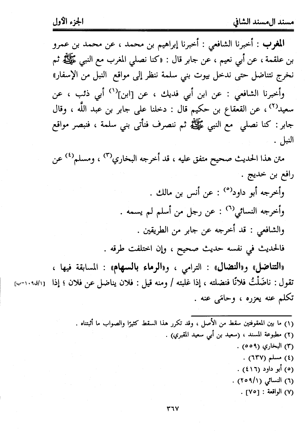 المغرب: أخبرنا الشافعي: أخبرنا إبراهيم بن محمد، عن محمد بن عمرو بن علقمة، عن أبي نعيم، عن جابر قال: "كنا نصلي المغرب مع النبي - صلى الله عليه وسلم - ثم نخرج نتناضل حتى ندخل بيوت بني سلمة ننظر إلى مواقع النبل من الإسفار" وأخبرنا الشافعي: عن ابن أبي فديك، عن [ابن] (¬1) أبي ذئب، عن سعيد (¬2)، عن القعقاع بن حكيم قال: دخلنا على جابر بن عبد اللَّه، وقال جابر: كنا نصلي مع النبي - صلى الله عليه وسلم - ثم ننصرف فنأتى بني سلمة، فنبصر مواقع النبل.