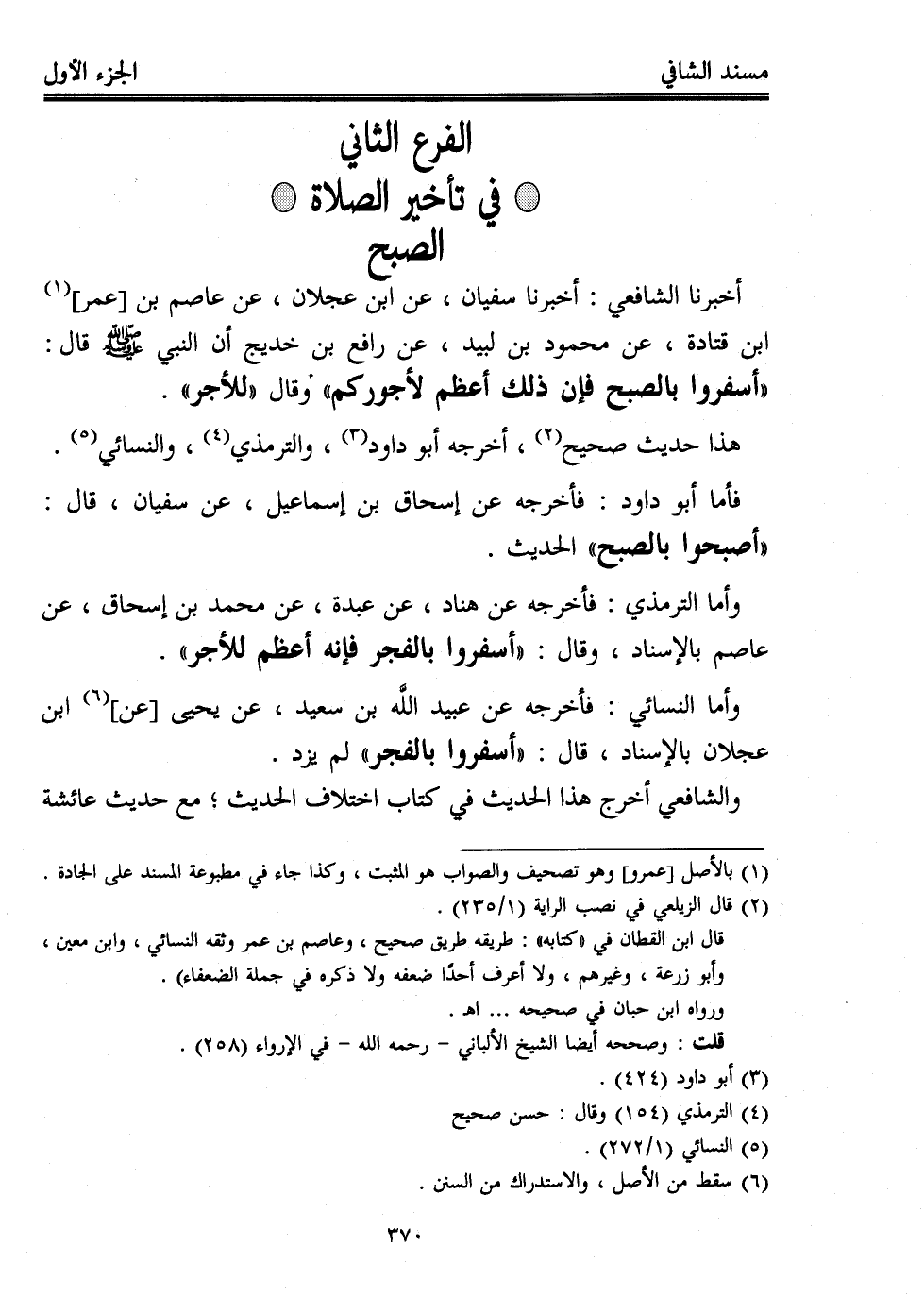 وأما الترمذي: فأخرجه عن هناد، عن عبدة، عن محمد بن إسحاق، عن عاصم بالإسناد، وقال: "أسفروا بالفجر فإنه أعظم للأجر".