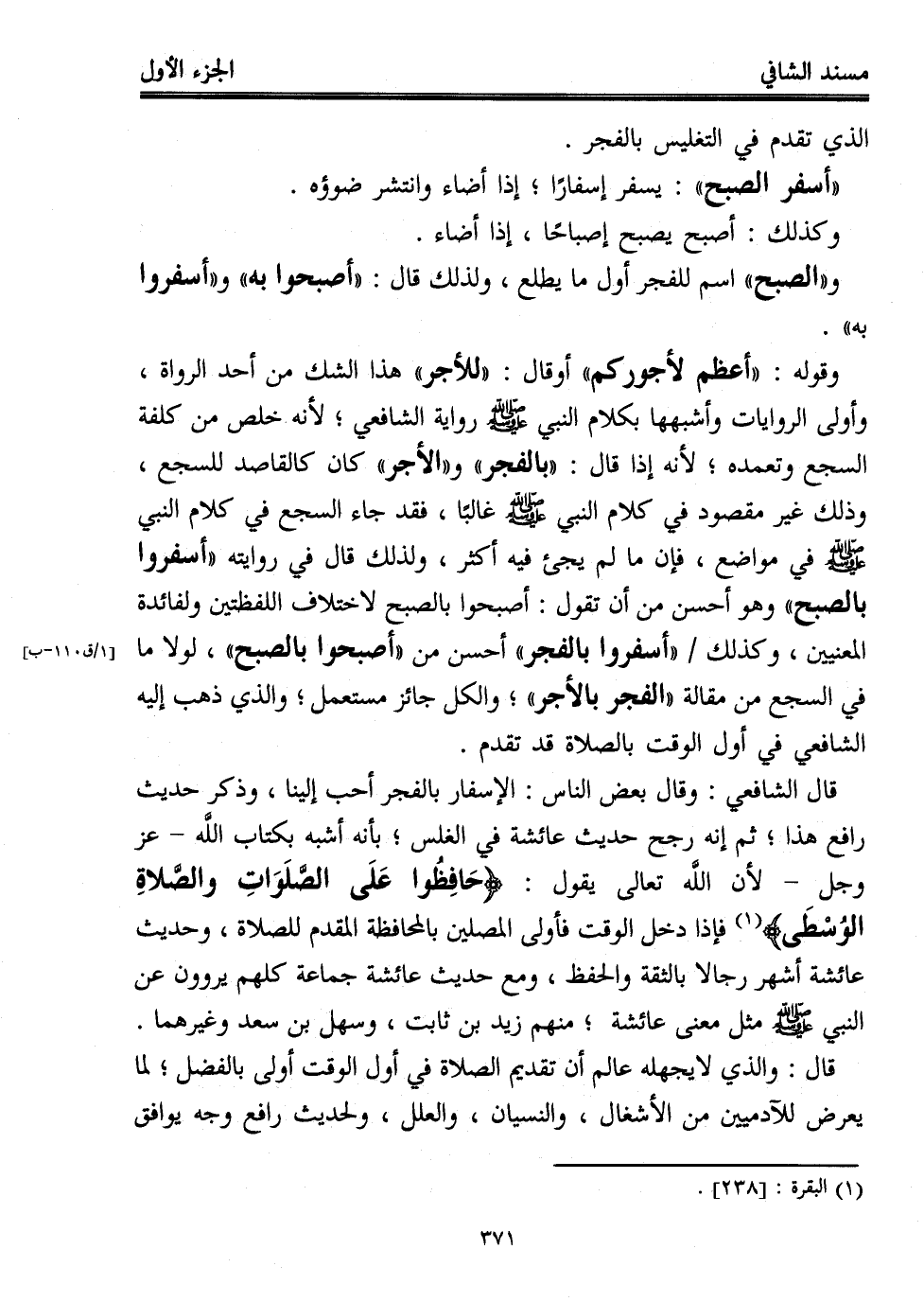 قال الشافعي: وقال بعض الناس: الإسفار بالفجر أحب إلينا، وذكر حديث رافع هذا؛ ثم إنه رجح حديث عائشة في الغلس؛ بأنه أشبه بكتاب اللَّه -عز وجل- لأن اللَّه تعالى يقول: {حَافِظُوا عَلَى الصَّلَوَاتِ وَالصَّلَاةِ الْوُسْطَى} (¬1) فإذا دخل الوقت فأولى المصلين بالمحافظة المقدم للصلاة، وحديث عائشة أشهر رجالا بالثقة والحفظ، ومع حديث عائشة جماعة كلهم يروون عن النبي - صلى الله عليه وسلم - مثل معنى عائشة؛ منهم زيد بن ثابت، وسهل بن سعد وغيرهما.