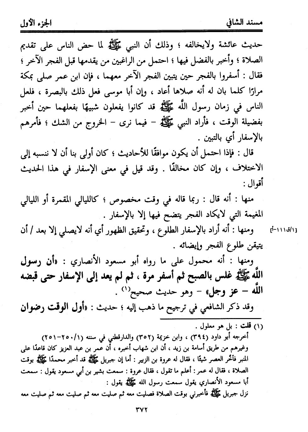 ومنها: أنه محمول على ما رواه أبو مسعود الأنصاري: "أن رسول اللَّه - صلى الله عليه وسلم - غلس بالصبح ثم أسفر مرة، ثم لم يعد إلى الإسفار حتى قبضه اللَّه -عز وجل- وهو حديث صحيح (¬1).